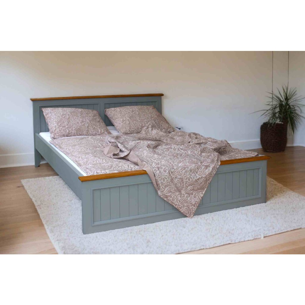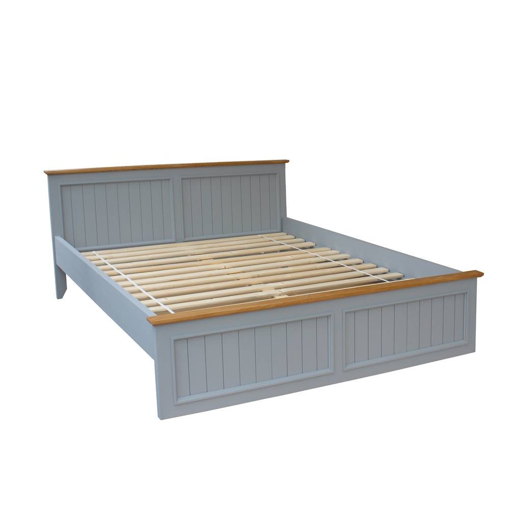Masivní postel PROVENCE je spojením bukového a dubového dřeva. Dubové dřevo (horní deska) je ošetřeno lakem a bukové dřevo je ošetřeno akrylovou barvou v šedomodré barvě.