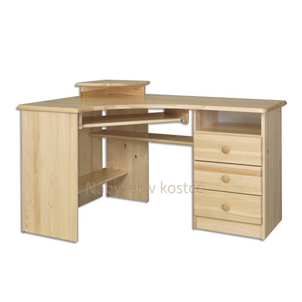 Rohový psací stůl Praděd BR107 nabízí výsuvnou desku na klávesnici, tři praktické zásuvky na kolečkových pojezdech, volnou polici a podstavec pro monitor. Stůl se prezentuje pečlivým zpracováním, vynikající stabilitou a dlouhou životností. K tomuto psacímu stolu doporučujeme židle z borovice.