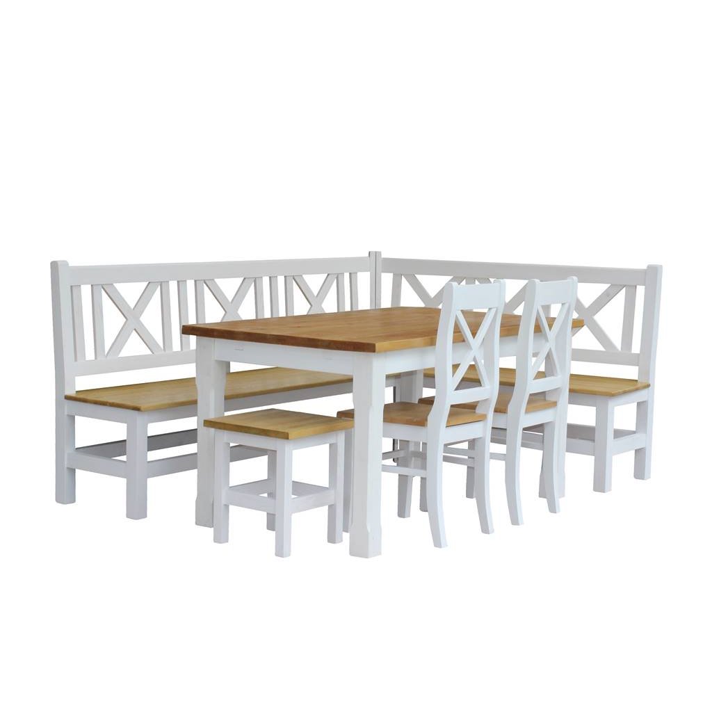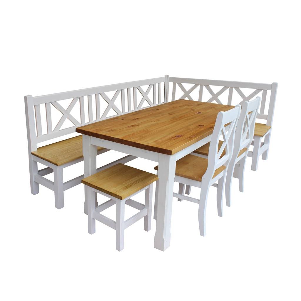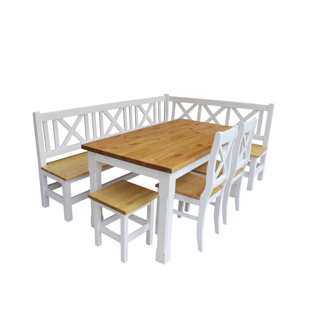 Rohová jídelní sestava SWEET HOME je nádherný nábytek do kuchyně i jídelny, který patři mezi populární produkt našich stálých zákazníku. Tento nábytek je vyroben z borovicového masivního dřeva a ošetřen bílou vodou ředitelnou barvou. Hnědé části mohou být ošetřeny voskem anebo lakem.