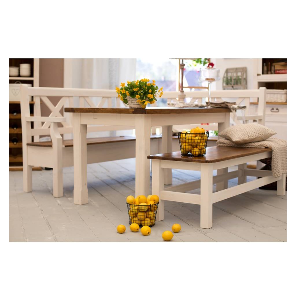 Rustikální lavice SWEET HOME s úložným prostorem je vyrobena z borovicového masivního dřeva a je ošetřena bílou vodou ředitelnou barvou. Horní deska je ošetřen barevným pigmentem v odstínu světle hnědá medová a následně lakem.