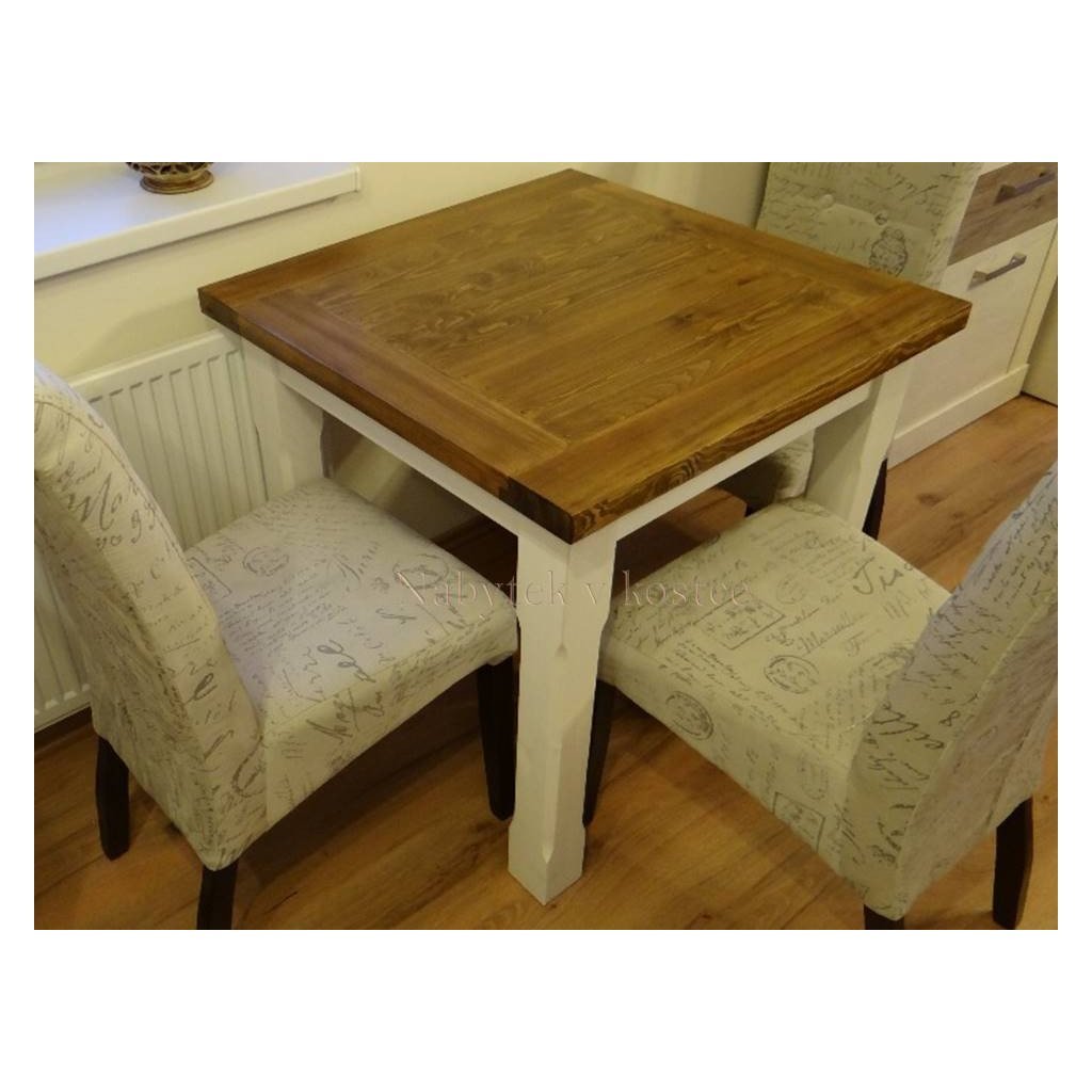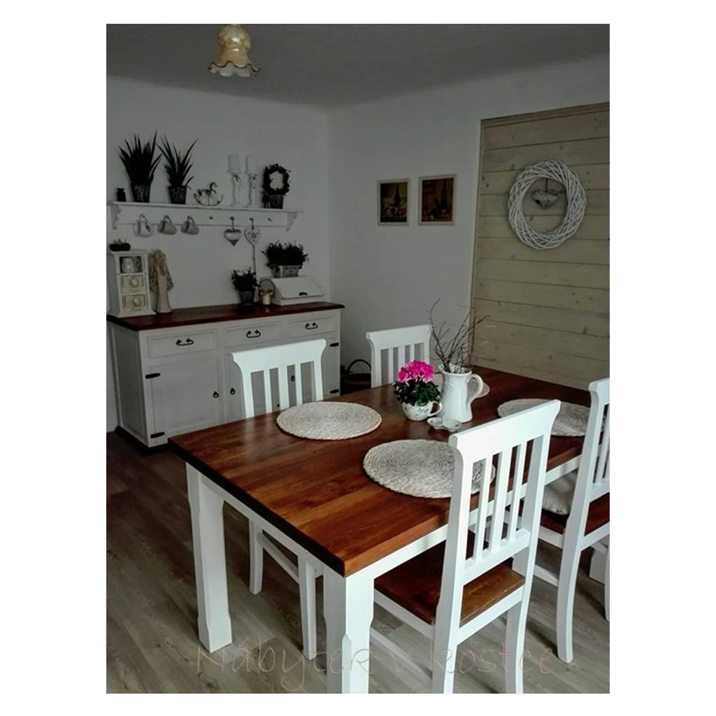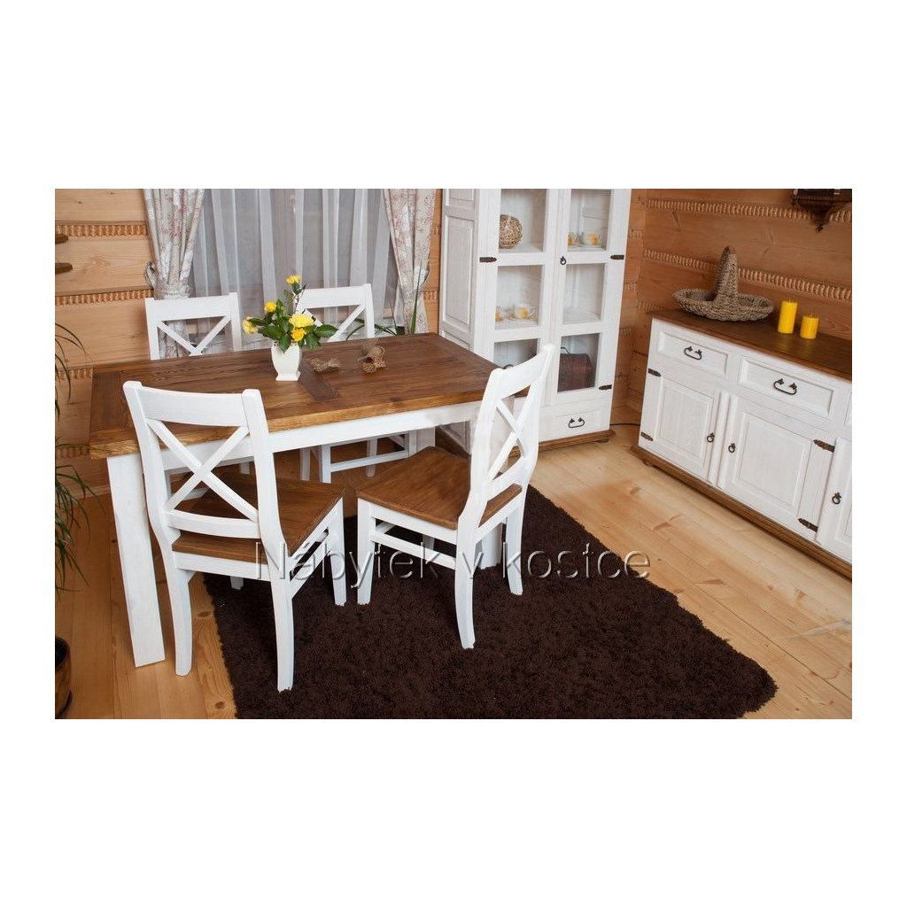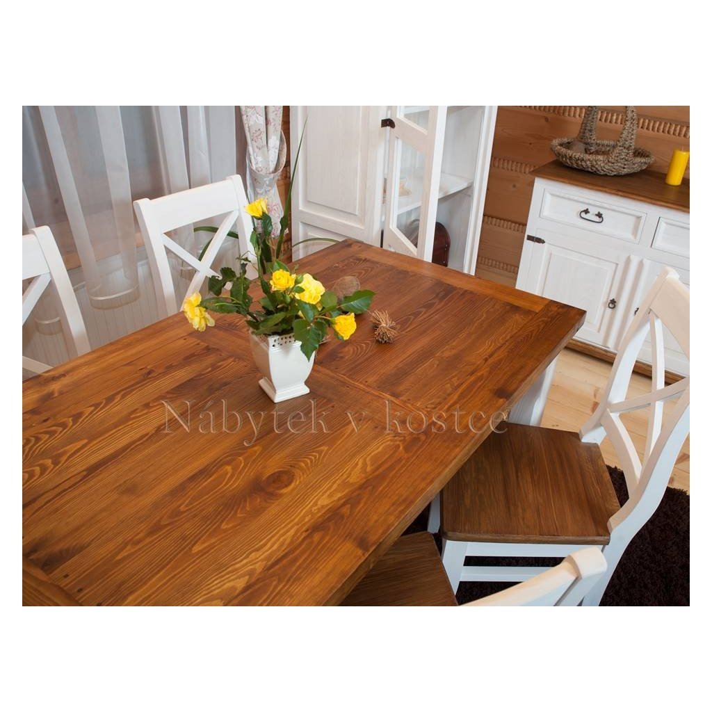 Rustikální stůl SWEET HOME MES2 je vyroben z borovicového masivního dřeva (tloušťka nohou je 8cm, deska stolu 4cm) a ošetřen bílou vodou ředitelnou barvou. Horní hnědá deska je ošetřena lakem v odstínu světle hnědá medová.