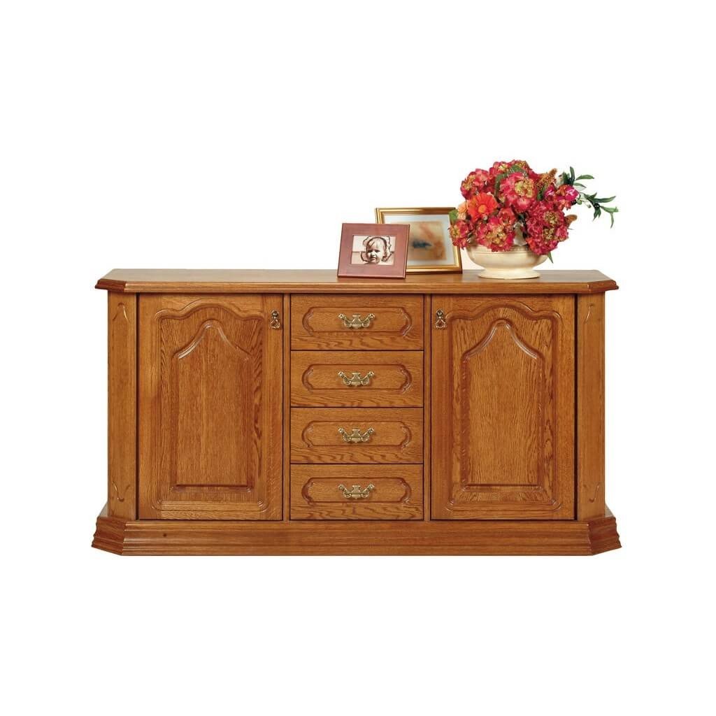 Rustikální komoda obsahuje tří nebo čtyři výsuvné šuplíky a po stranách dvířka. Vše opatřeno krásnými mosaznými úchyty. Horní a dolní část této komody je vyrobená z lakované MDF, boky jsou z lamina a přední část tvoří dubový masív.