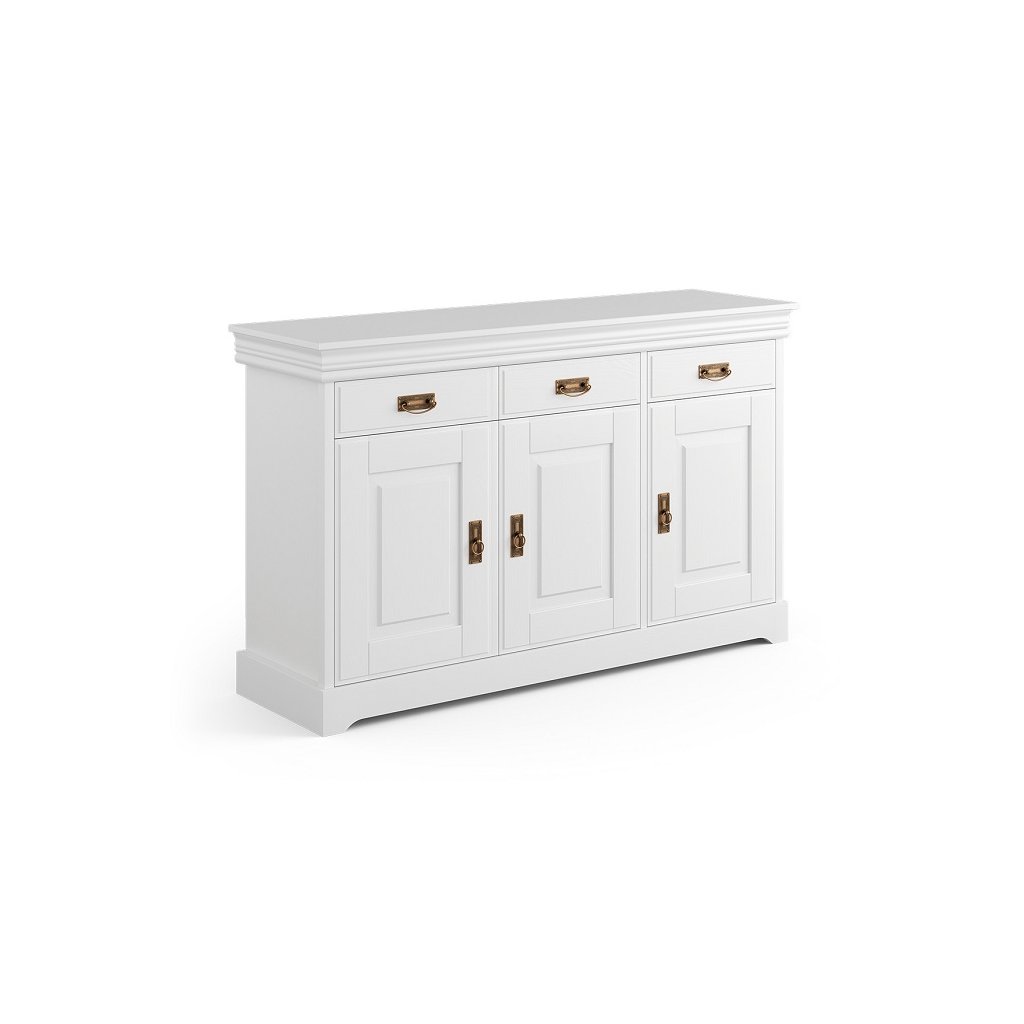 Rustikální komoda TOSKANIA z masivu nabízí šuplíky a skříňky s policí, pro praktické uložení všech potřebných věcí. Horní pevná deska je naopak místem, kde můžete vystavit květiny nebo své oblíbené dekorace. Za pozornost stojí kovové úchyty v dekoru starého zlata, které podtrhují toskánský styl této třídveřové komody. Komoda je opatřena systémem tichého zavírání.