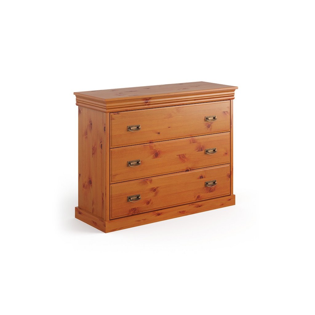 Rustikální komoda TOSKANIA z masivu je vyrobena z masivní finské borovice a namořen do teplého medového odstínu, které daruje interiérům hřejivé kouzlo domova. Finská borovice vyniká svojí odolnosti a nádhernou dřevitou strukturou, kterou můžeme cítit, při každém doteku. Dna šuplíku a záda komody jsou vyrobeny z dřevovláknité desky HDF.