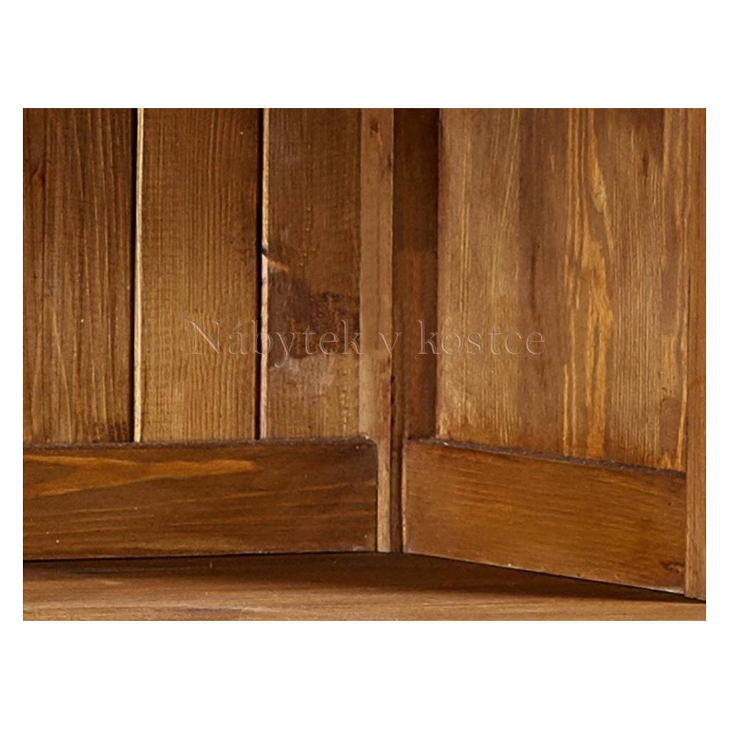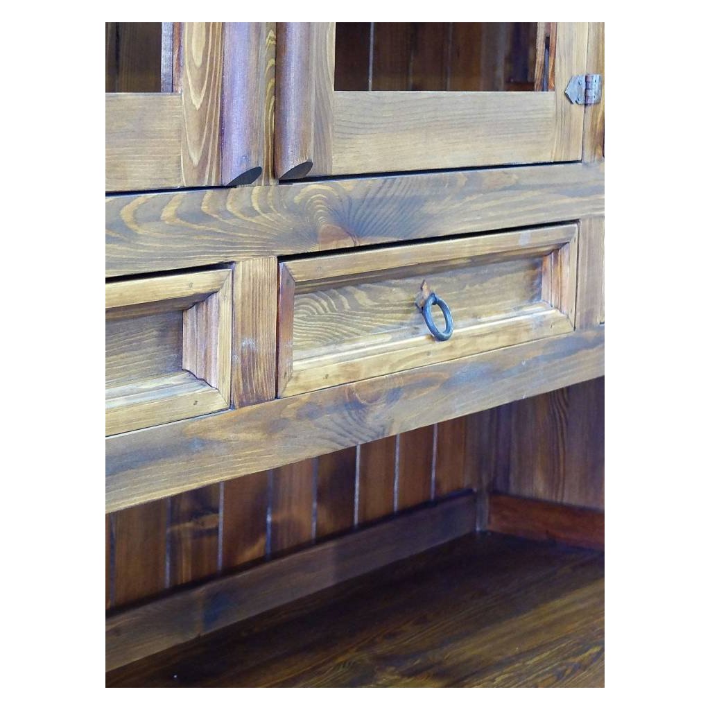 Rustikální kredenc MEXICANA je celomasivní příborník či skříň do jídelny i kuchyně, vyrobený z borovicového masivního dřeva ošetřen voskem nebo lakem, dle výběru (vosk světle hnědý-medový, ořech, kaštan, dub tmavý, dub kouřový anebo vosk bezbarvý). Ze dřeva jsou rovněž vyrobeny i pojezdy na šuplíky a police. Vosk je ručně nanášený štětcem.