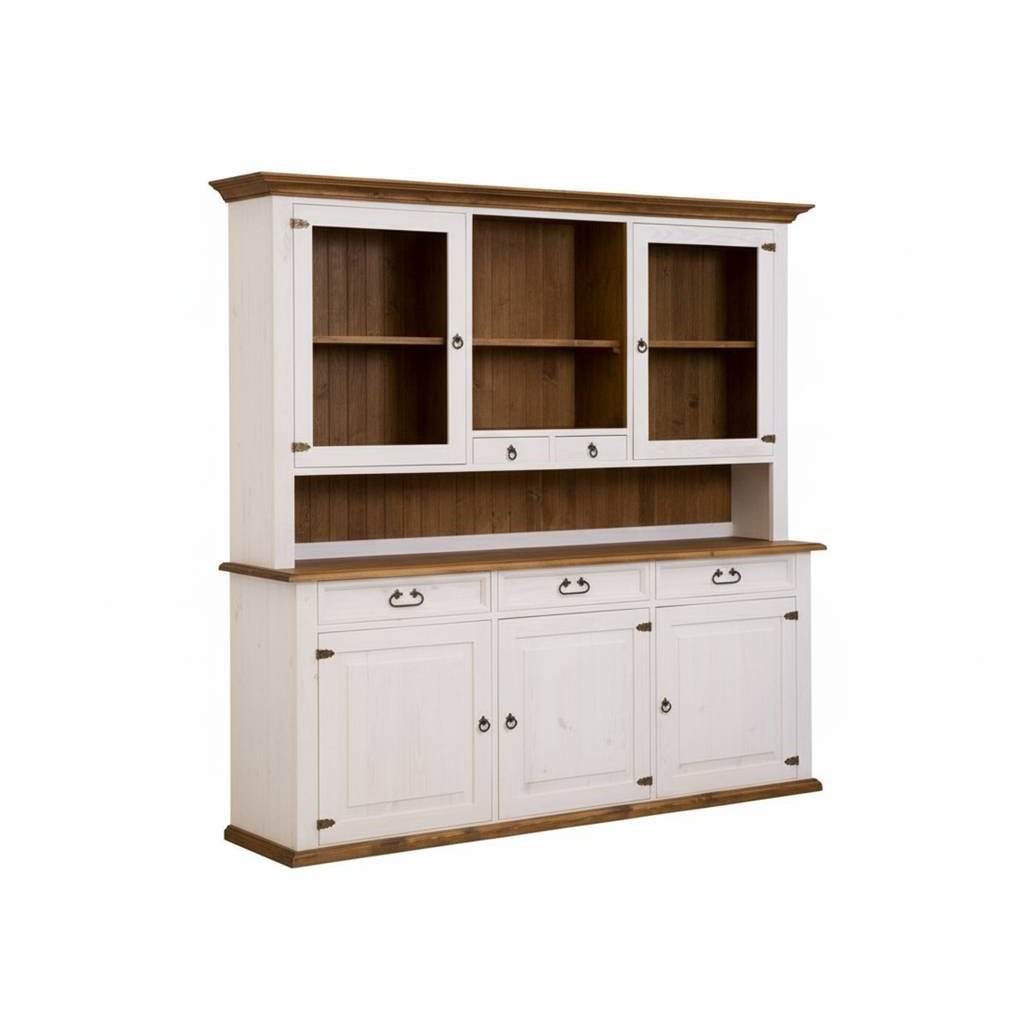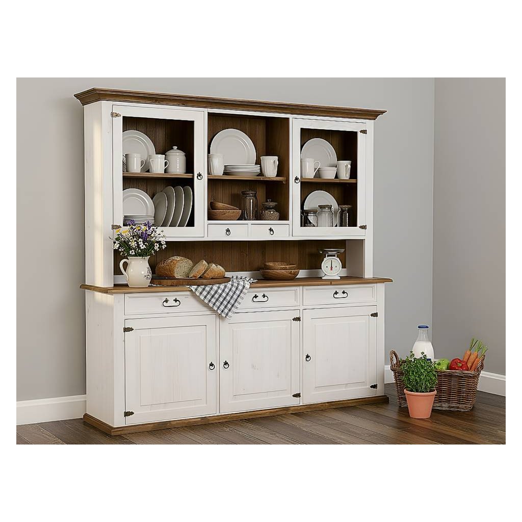 Rustikální kredenc SWEET HOME je masivní příborník či skříň do jídelny i kuchyně, vyrobený z borovicového masivního dřeva a ošetřen bílou vodou ředitelnou barvou. Hnědé části mohou být ošetřeny voskem anebo lakem. Ze dřeva jsou rovněž vyrobeny i pojezdy na šuplíky a zadní část, díky čemuž působí vitrína opravdu luxusně a stylově.
