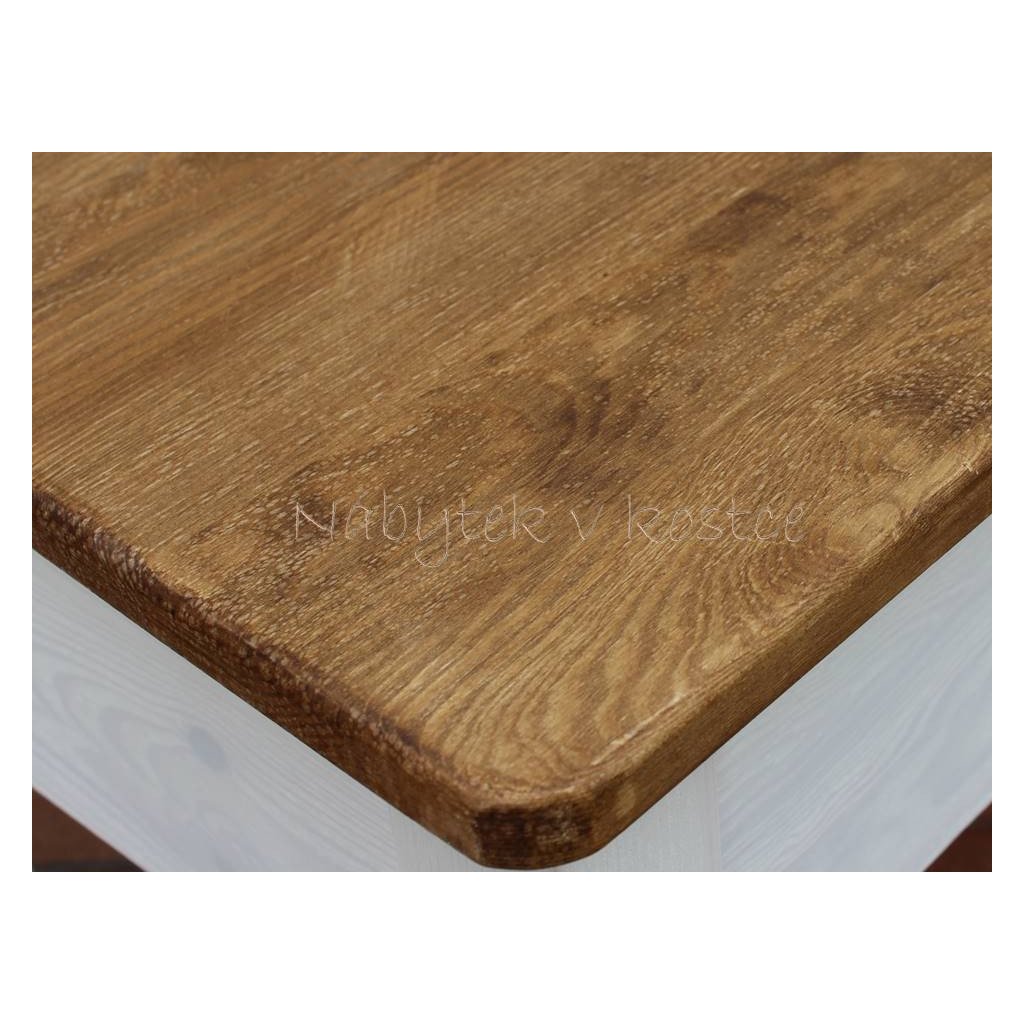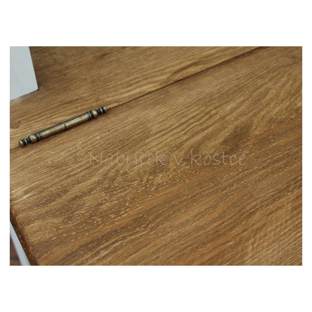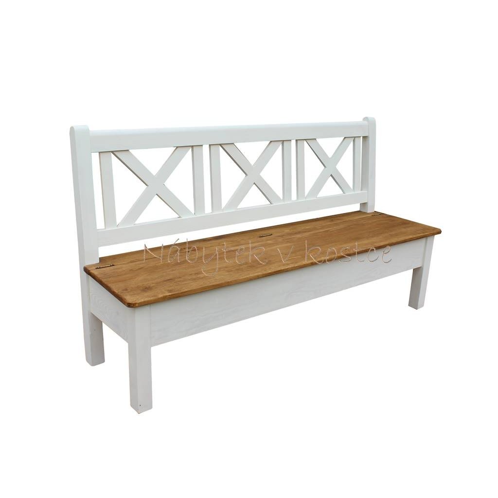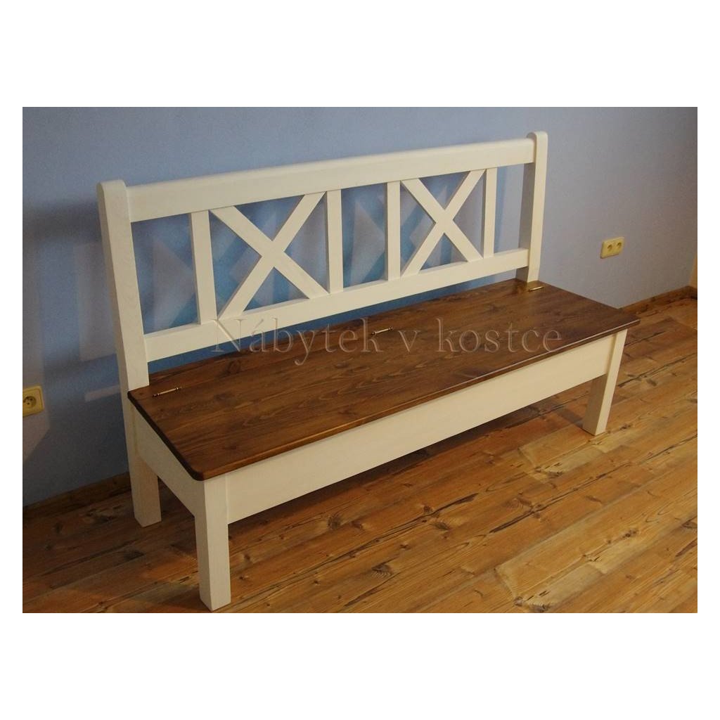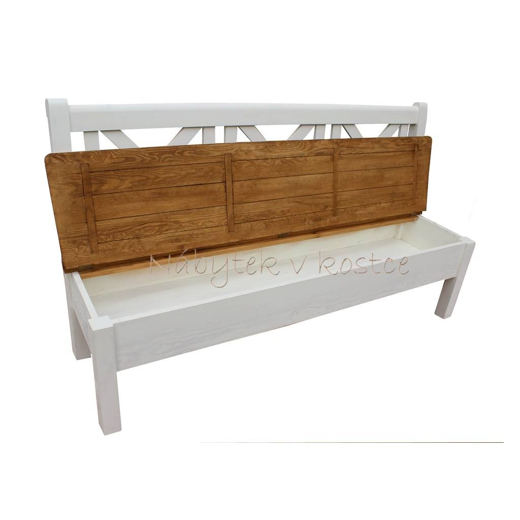 Rustikální lavice SWEET HOME s úložným prostorem je vyrobena z borovicového masivního dřeva a je ošetřena bílou vodou ředitelnou barvou. Horní deska je ošetřen barevným pigmentem v odstínu světle hnědá medová a následně lakem.