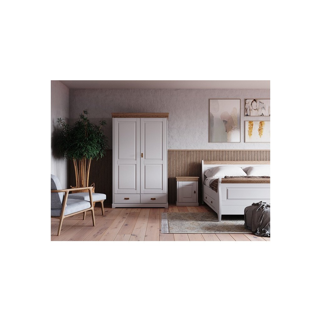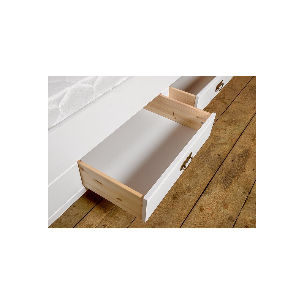 Rustikální postel TOSKANIA z masivu je vyrobena z masivní finské borovice a ošetřena bílou vodou ředitelnou barvou, která rozjasní jakékoliv interiéry vašeho domova. Finská borovice vyniká svojí odolnosti a nádhernou dřevitou strukturou, kterou můžeme cítit, při každém doteku. Dna šuplíku jsou vyrobeny z dřevovláknité desky HDF.
