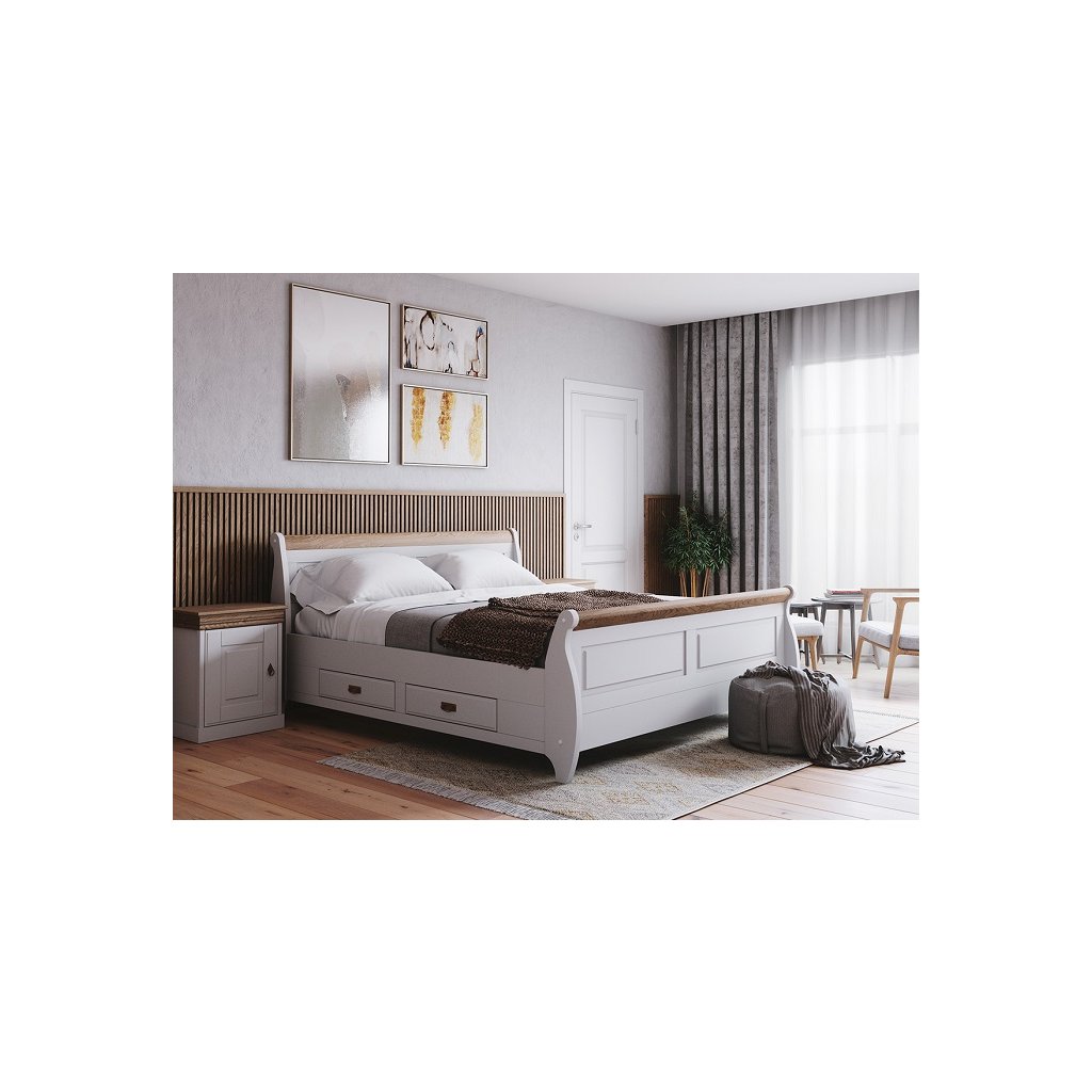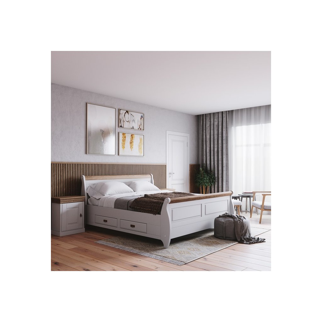 Rustikální postel TOSKANIA z masivu je vyrobena z masivní finské borovice a ošetřena bílou vodou ředitelnou barvou, která rozjasní jakékoliv interiéry vašeho domova. Horní deska je namořena do medového odstínu. Finská borovice vyniká svojí odolnosti a nádhernou dřevitou strukturou, kterou můžeme cítit, při každém doteku. Dna šuplíku jsou vyrobeny z dřevovláknité desky HDF.