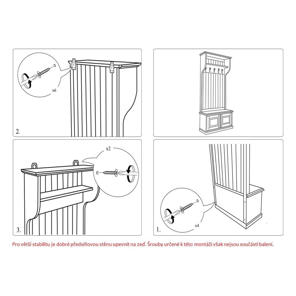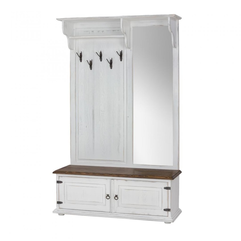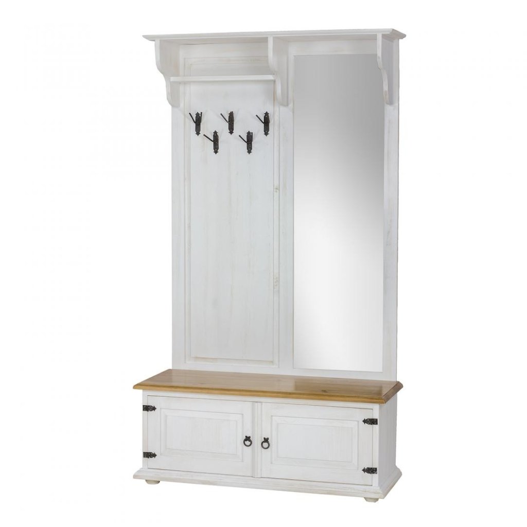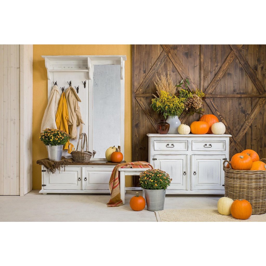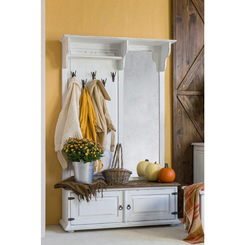 Rustikální předsíňová stěna WHITE HOME je vyrobena z borovicového masivu vysoké kvality a ošetřena voskem. Předsíň má v horní části na pravé straně velké zrcadlo, zatímco na levé straně je umístěna police, pod kterou je pět věšáků. Ve spodní části jsou dvoje dvířka, za kterými se nachází botník. Předsíňová skříňka je opatřena stylovými kovovými úchyty a panty.