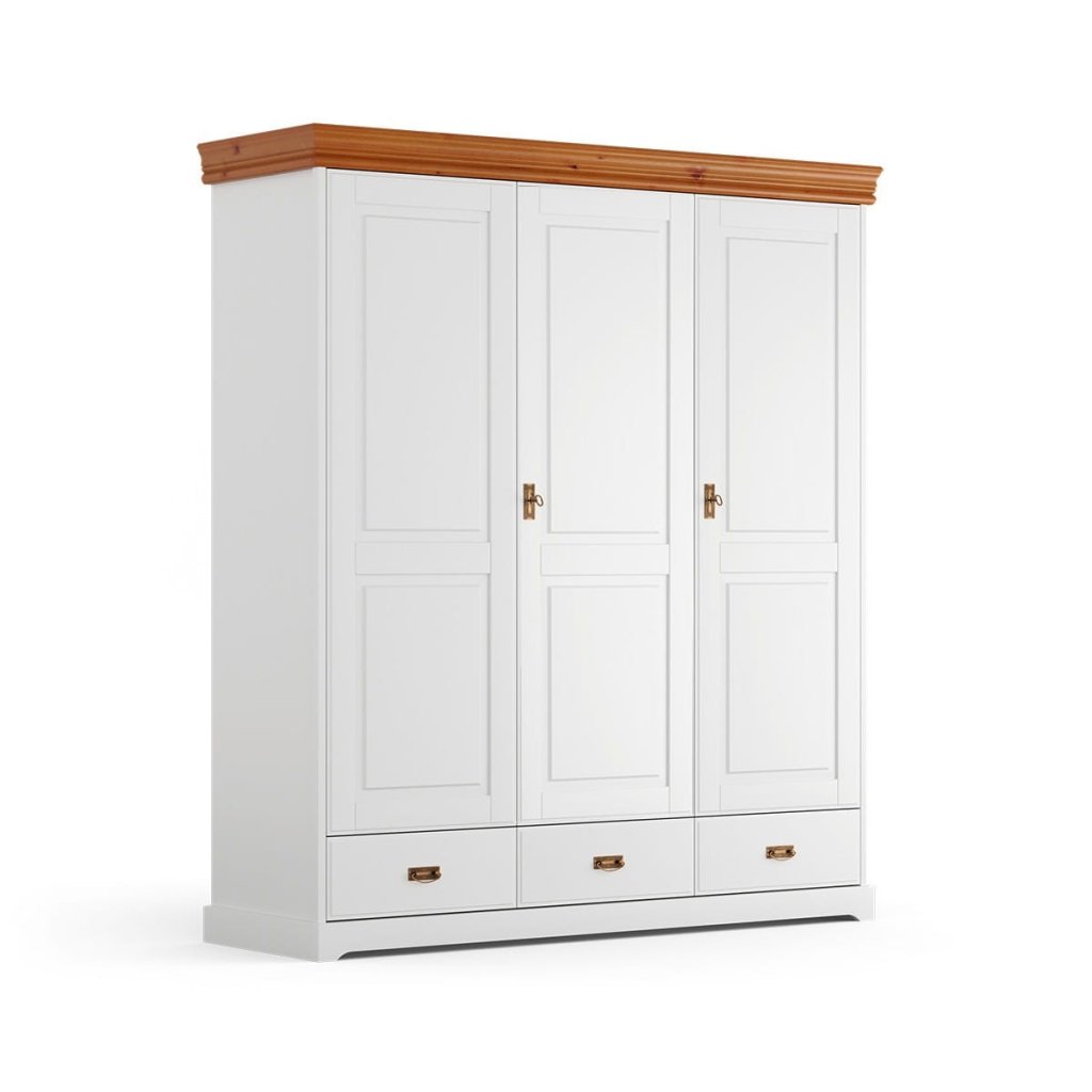 Rustikální skříň TOSKANIA z masivu je vyrobena z masivní finské borovice a ošetřena bílou vodou ředitelnou barvou, která rozjasní jakékoliv interiéry vašeho domova. Horní deska je namořena do medového odstínu. Finská borovice vyniká svojí odolnosti a nádhernou dřevitou strukturou, kterou můžeme cítit, při každém doteku. Dna šuplíku a záda skříně jsou vyrobeny z dřevovláknité desky HDF.