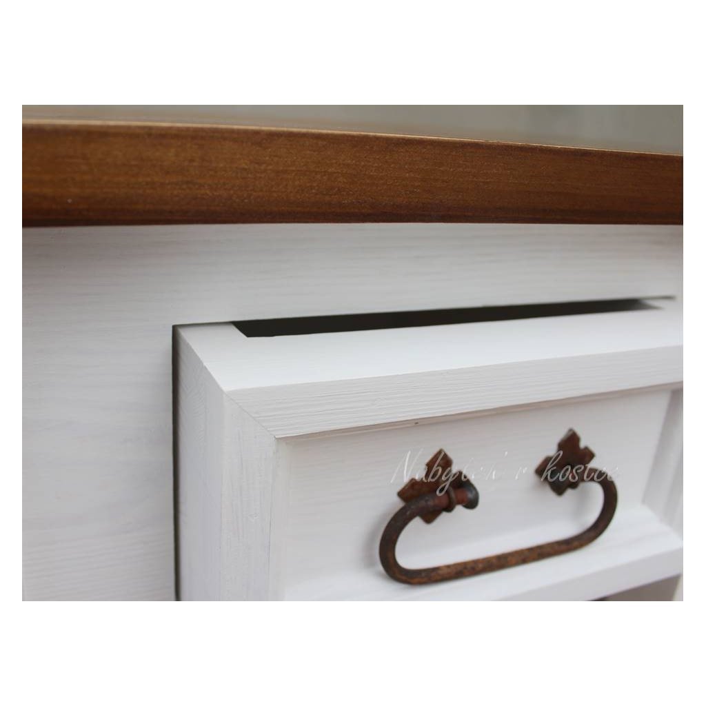 Rustikální stolek SWEET HOME je vyroben z borovicového masivního dřeva. Stolek z masivu je ošetřena pouze bílou vodou ředitelnou barvou, anebo ve dvoubarevné kombinaci (viz. vzorník). Ze dřeva jsou rovněž vyrobeny i pojezdy na šuplíky a police. Pro snazší údržbu doporučujeme objednat nábytek s vrchní hnědou deskou v lakované verzi. Rozměr šuplíků: šířka: 30 cm, výška: 12 cm, hloubka: 33 cm.