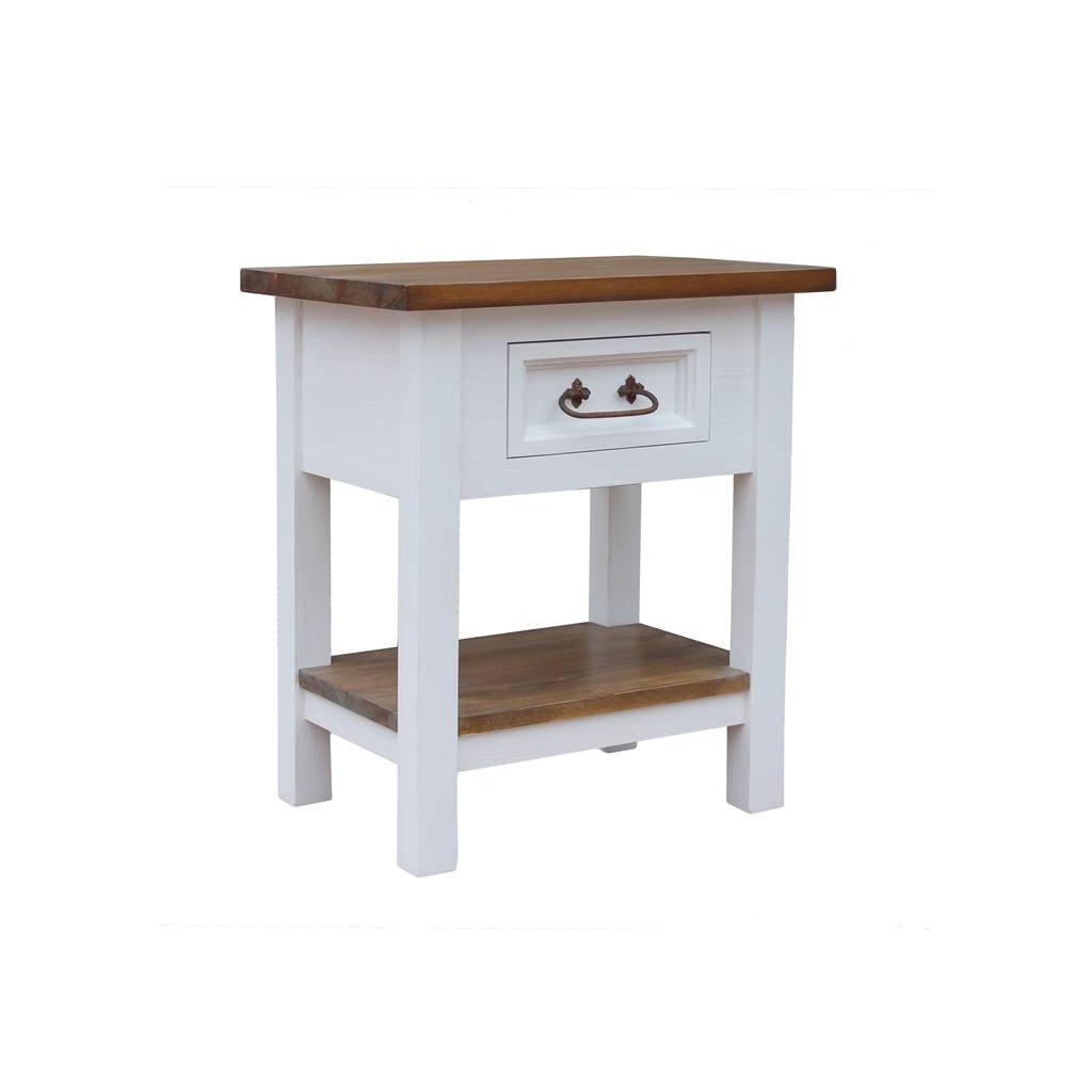 Rustikální stolek SWEET HOME nabízí policí a šuplík, vše doplněno o stylové úchyty.
