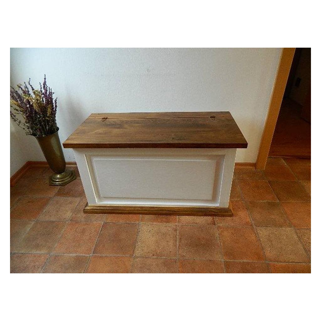 Rustikální truhla SWEET HOME patří mezi populární produkt našich stálých zákazníku. Truhla je vyrobena z borovice a ošetřena bílou vodou ředitelnou barvou. Horní hnědé plochy mohou být ošetřeny voskem anebo lakem. Pro snazší údržbu doporučujeme objednat nábytek s vrchní hnědou deskou v lakované verzi.