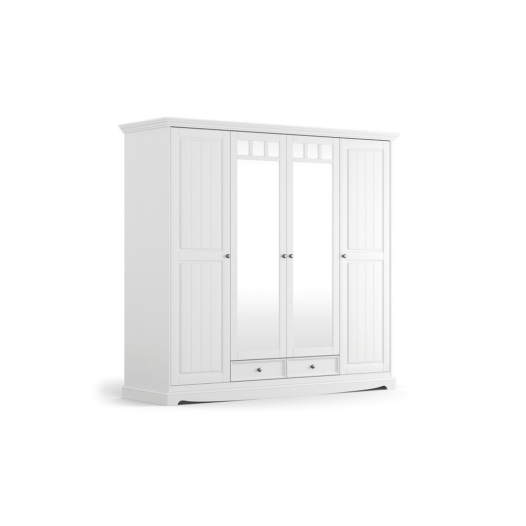Šatní skříň BELLUNO Elegant 4D je jednoduchá a univerzální bílá čtyřdveřová skříň s šatní tyčí, policemi, šuplíkem a zrcadlem. Skříň lze díky promyšlenému tvaru a nadčasové bílé využít jako šatní skříň do téměř jakékoliv místnosti. Je velmi praktická a pojme velké množství oblečení, nabízí tedy dostatek úložného prostoru. Šatní tyč je skvělým místem pro uložení svrchního oblečení a oblečení, které je třeba po složení znovu vyžehlit. Boční strany tvoří čtyři prostorné police. Šuplík je navíc vybaven systémem tichého zavíraní. Dřevěnou šatní skříň zdobí vykrajovátka na dvířkách a kovové úchyty. Přírodní dřevo, ze kterého je skříň vyrobena, dodává neopakovatelnou atmosféru interiéru.