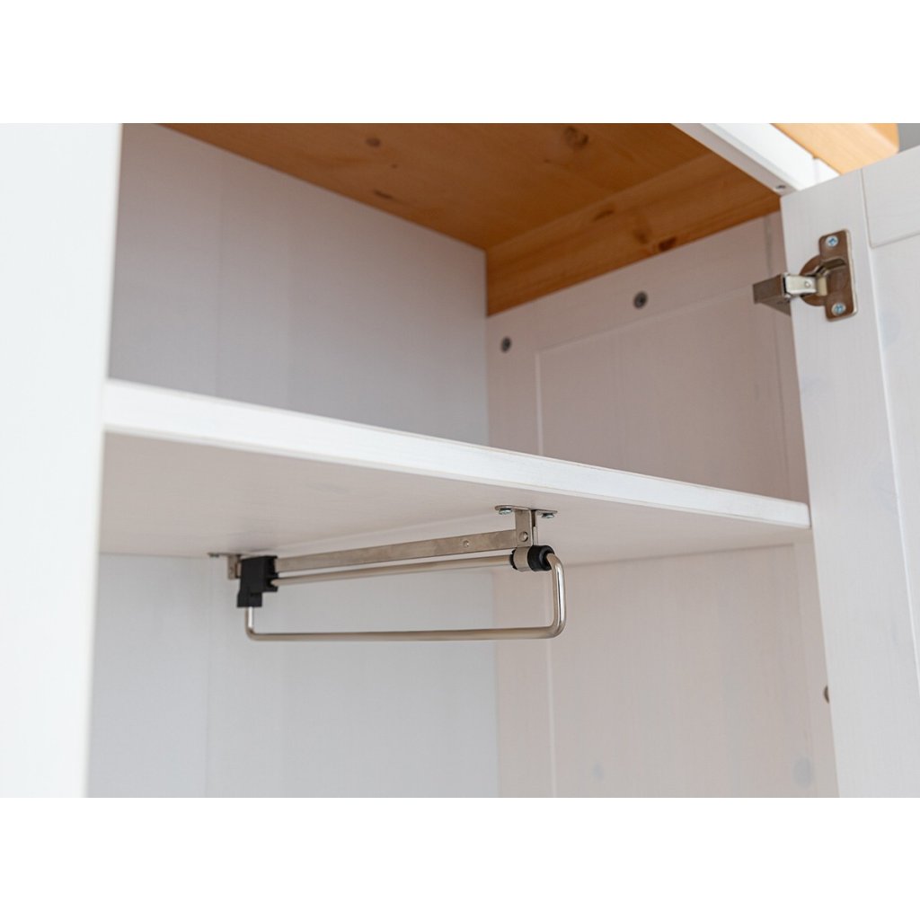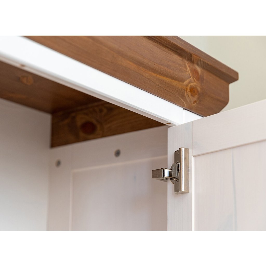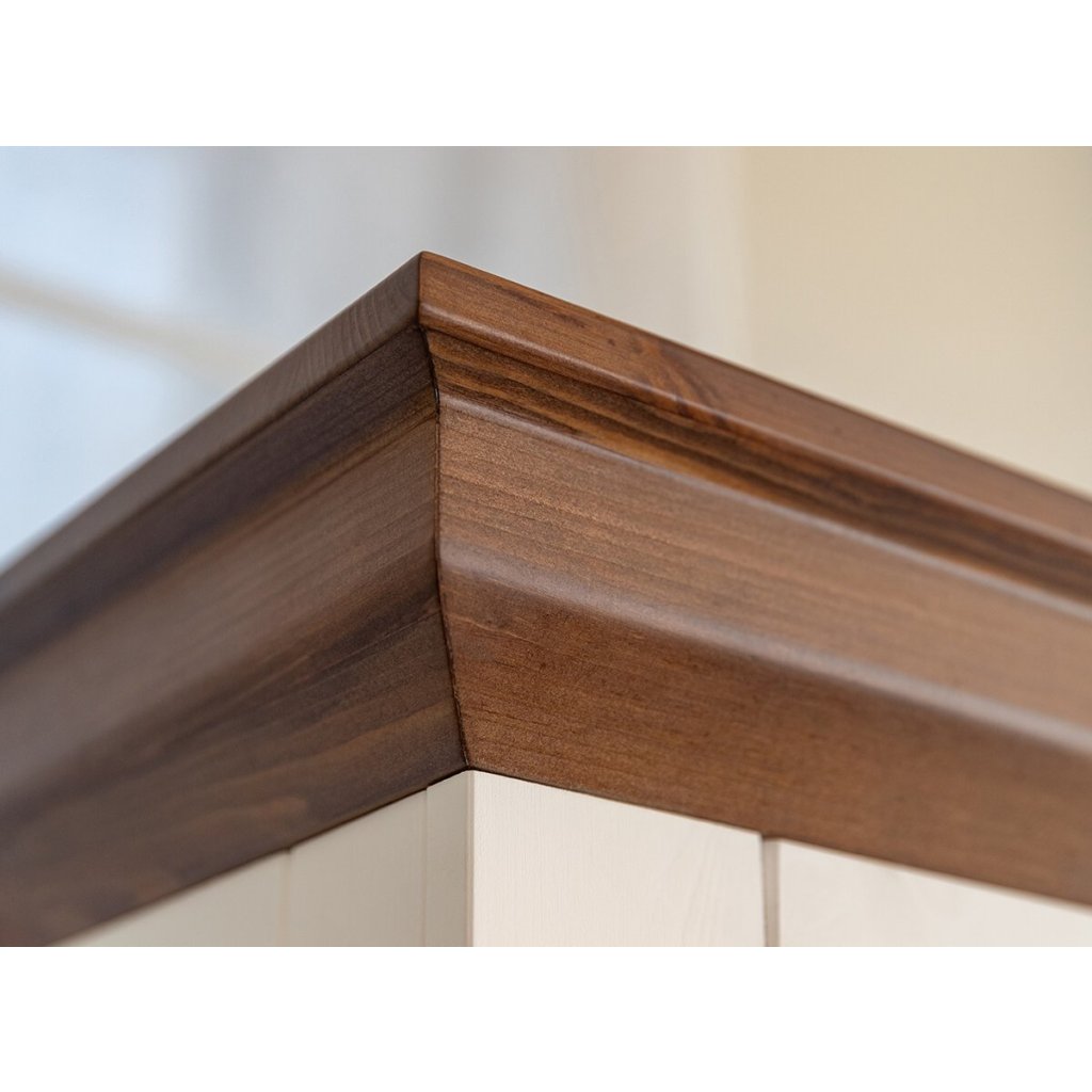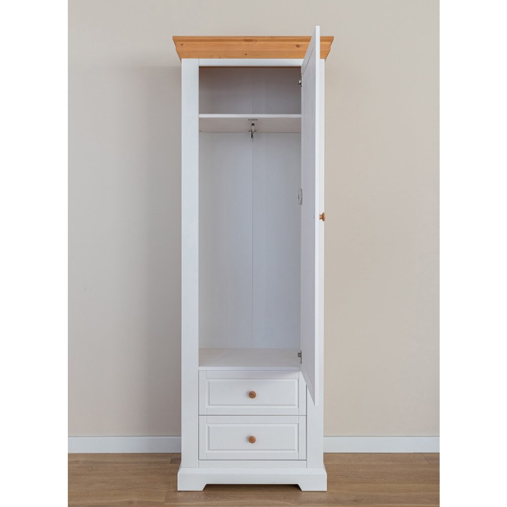 Skříň je vybavena jedněmi dvířky s vnitřní policí a dvěma zásuvkami, které nabízejí dostatek místa pro oblečení, doplňky nebo dokumenty. Tiché dovírání zásuvek a pečlivě frézované detaily podtrhují vysokou kvalitu zpracování. Povrchová úprava bílou ekologickou barvou s jemnou kryvostí zvýrazňuje přirozenou kresbu dřeva, zatímco horní deska v teplém odstínu tabacco dodává nábytku osobitý charakter.