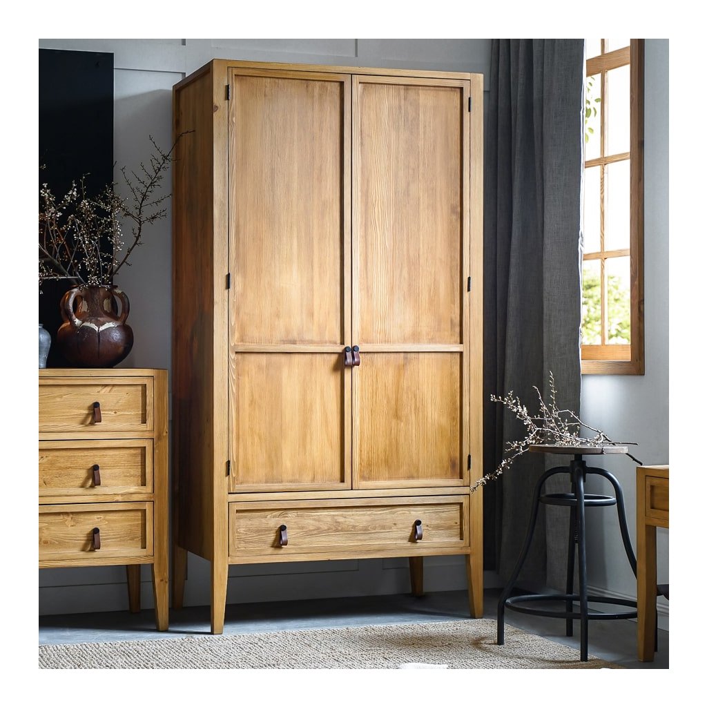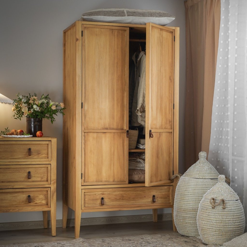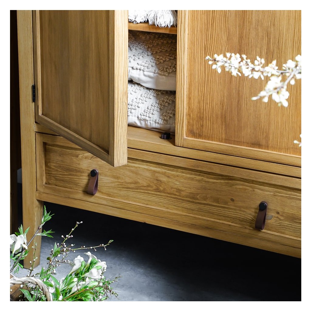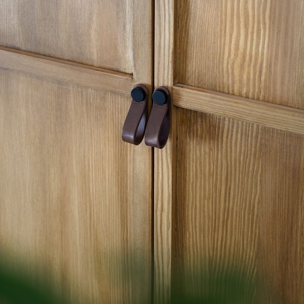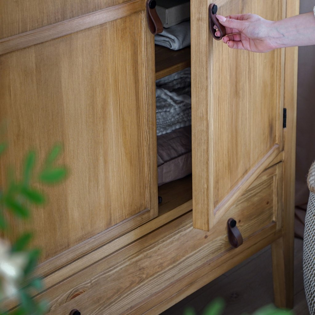 Nábytek je vyroben z borovicového masivu a ošetřen voskem, který zprostředkovává atmosféru přírodního prostředí. Úchytky z kvalitní kůže jsou dalším prvkem, který dotváří luxusní dojem a estetiku nábytku. Každý detail, včetně kožených doplňků, je vybrán s ohledem na elegantní provedení a funkčnost, čímž přidává nábytku další rozměr elegance a vkusu.