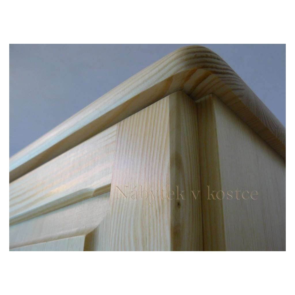Nábytek je vylepšen ušlechtilým frézováním. Úchytky na dvířkách mají kulatý tvar a jsou vyrobeny taktéž z borovice. Nožky mají kulatý tvar a perfektně podtrhují eleganci nábytku.