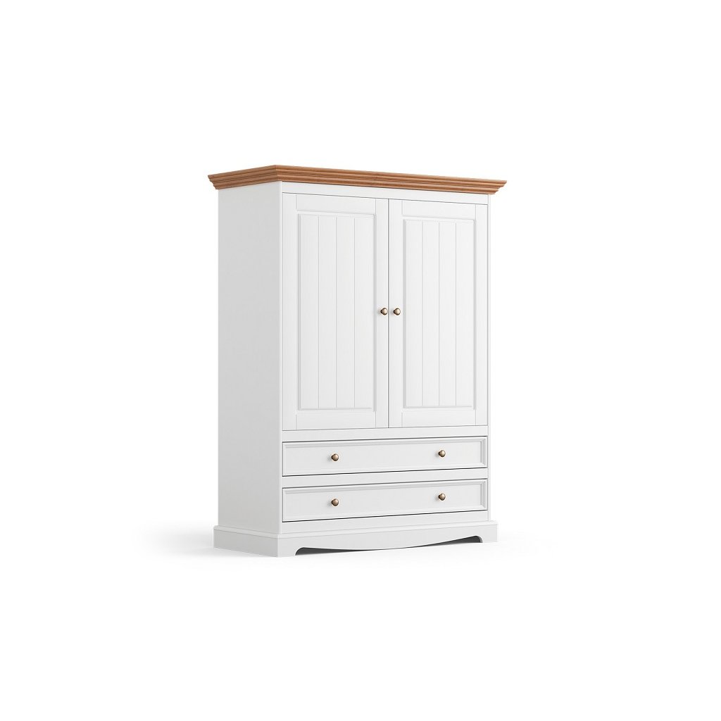 Skříň BELLUNO Elegante je jednoduchá a univerzální bílá dvoudveřová skříň s šatní tyčí a policemi. Skříň lze díky jednoduchému tvaru a nadčasové bílé využít jako šatní skříň do téměř jakékoliv místnosti. Je ideální jako úložný prostor pro vaše oblečení, protože má na levé straně šatní tyč a na pravé dvě prostorné police. Navíc pod skříňkou jsou dva skvěle využitelné šuplíky se systémem tichého zavírání. Dřevěnou skříň zdobí vykrajovátka na dvířkách a kovové úchyty. Přírodní dřevo, ze kterého je skříň vyrobena, dodává neopakovatelnou atmosféru interiéru.