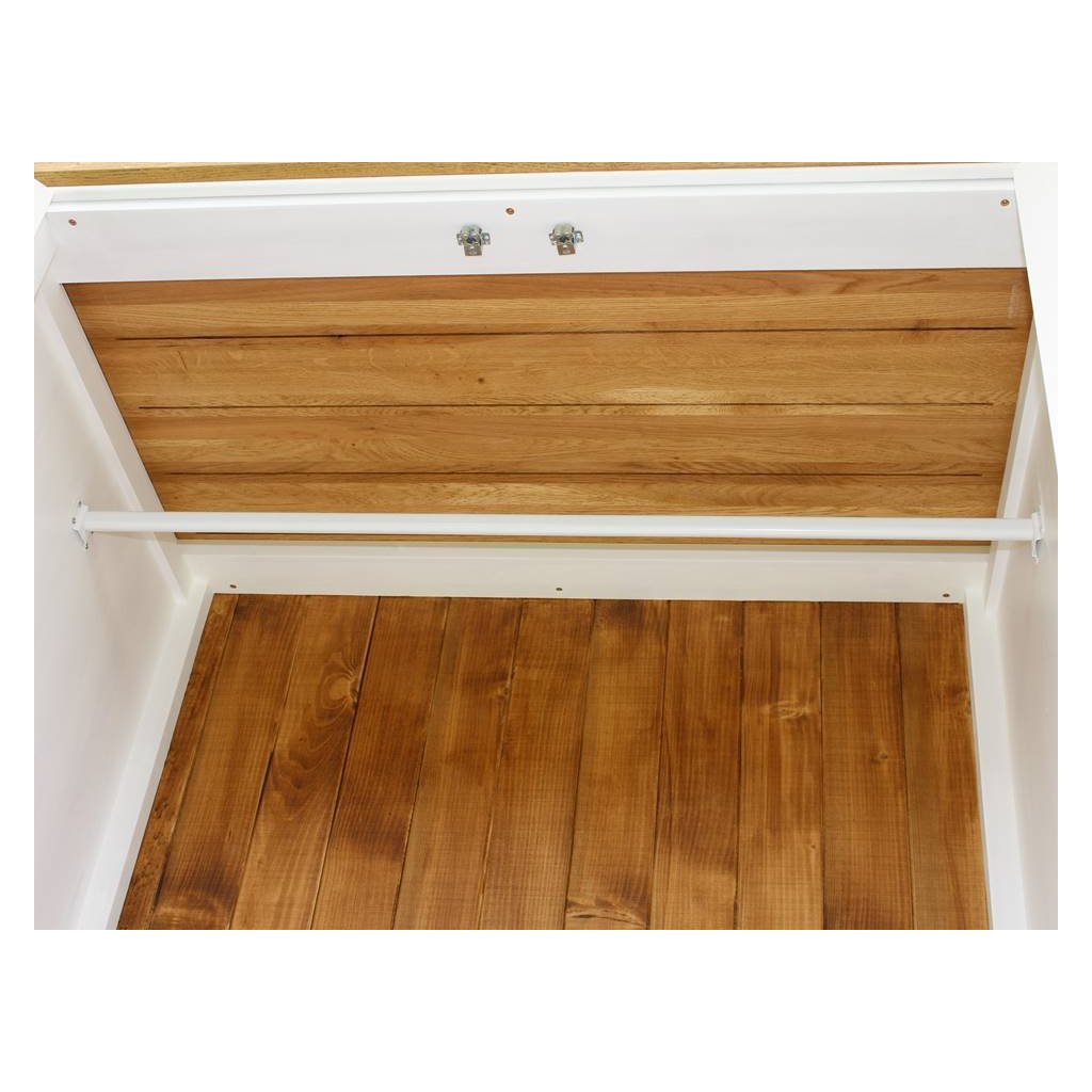 Masivní skříň PROVENCE je šatní skříň s policemi vyrobená z masivního bukového dřeva, které je ošetřeno akrylovou barvou v krémovém odstínu, a z masivního dubového dřeva (horní deska), které je ošetřeno lakem. Díky spojení těchto dvou druhů masivního dřeva získala masivní skříň jedinečný vzhled, který zdokonalí veškerý interiér.