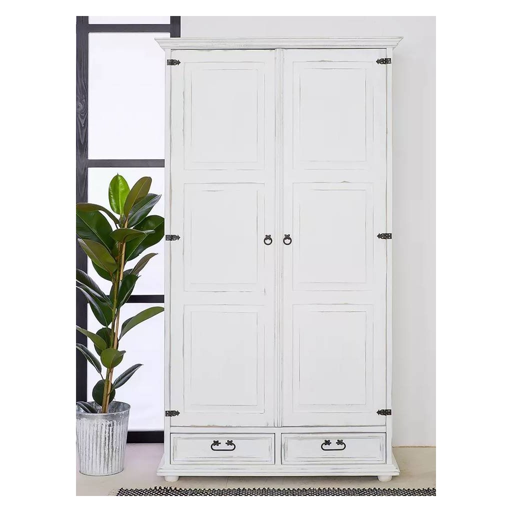 Rustikální šatní skříň WHITE HOME Slim SZY102 nabízíme rovněž v provedení - B/ kombinovaná a C/ s policemi. U každé varianty jsou dole 2 praktické šuplíky. Skříň je opatřena stylovými kovovými úchyty a panty.