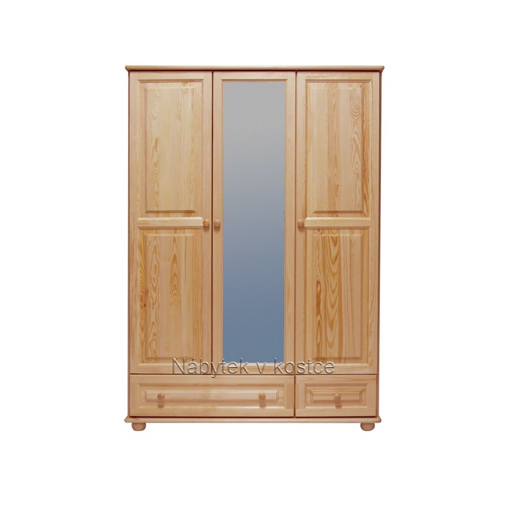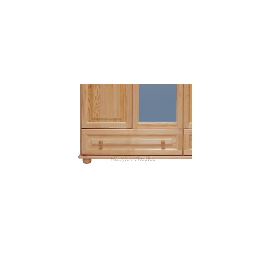 Skříň z masivu Šumava 65b se skládá z polic, které jsou ukryty v jedné skříňce. Ve zbývající dvoudvéřové části je ukryta tyč k pověšení ramínek. Ve spodní části se nacházejí 2 šuplíky. Elegantní vzhled je doplněn dřevěnými kulatými úchyty, které jsou v souladu s tvarem nožek. Na jedněch dveřích je velké zrcadlo, ve kterém si budete moci kdykoliv zkontrolovat svůj vzhled. Ostatní dveře jsou ozdobeny mírným frézováním.