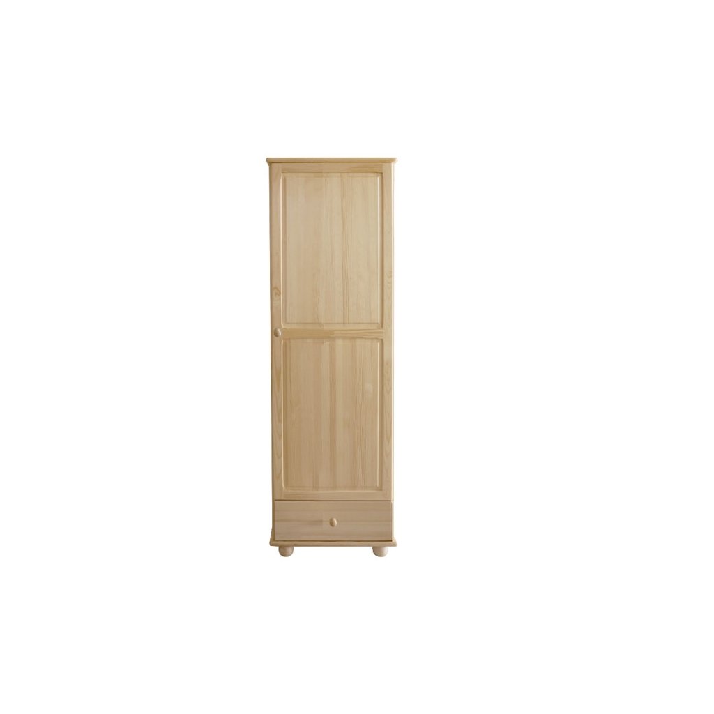 Skříň z masivu Šumava 70 dodáváme ve dvou variantách. Můžete si zvolit z možnosti policové, či šatní skříně s tyčí na ramínka. Obě varianty mají dole praktický šuplík. Elegantní vzhled skříně je zdokonalen dřevěnými kulatými úchyty, které perfektně ladí s tvarem nožek. Dveře jsou decentně zdobeny frézováním.