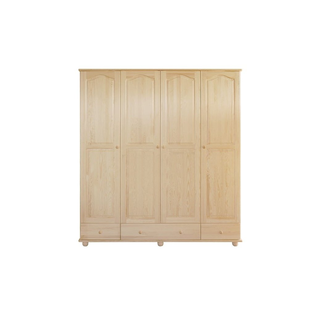 Skříň z masivu Šumava nabízí v prostřední dvoudveřové části šatní tyč. Postranní jednodvéřové části nabízejí police. Ve spodní části se nachází šuplíky. Elegantní vzhled je doplněn dřevěnými kulatými úchyty, ladícími s tvarem nožek. Dveře jsou zdobeny jemným frézováním.