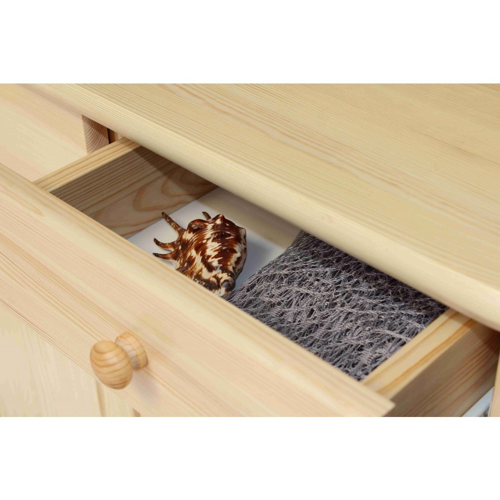 Skříňka z masivu Šumava 17 nabízí úložný prostor v podobě skříňky a dvou šuplíku v horní části s kvalitními kovovými pojezdy. Skříňka je vyrobená z jakostního borovicového masívu a doplněna ozdobným frézováním, které skříňce dodávají rustikální vzhled. Efektivní vzhled dotvářejí také kulaté úchyty a masivní nohy ve tvaru koule. Zadní stranu tvoří sololit, což je dřevovláknitá deska, vyrobená na bázi dřeva. Pro zachování přírodního vzhledu a pro usnadnění údržby je skříňka nalakována bezbarvým ekologickým lakem. Všechny materiály, z kterých je skříňka zhotovena splňují přísná evropská kritéria pro zdravotní a ekologickou nezávadnost.