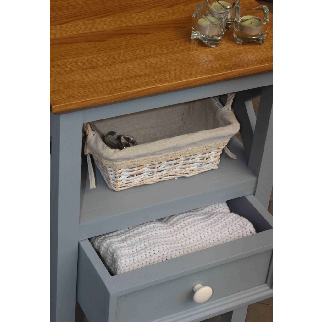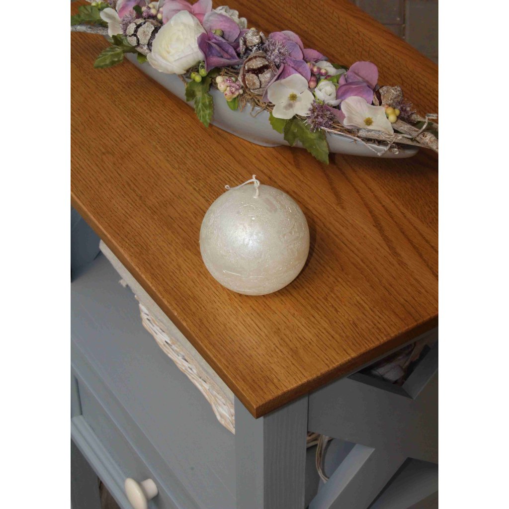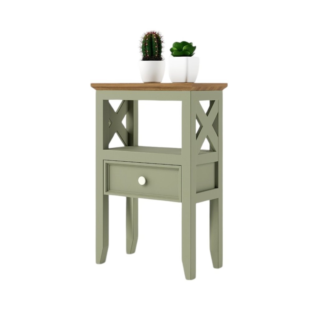 Masivní odkládací stolek PROVENCE je stolek vyrobený z masivního bukového dřeva, které je ošetřeno akrylovou barvou v olivovém odstínu, a z masivního dubového dřeva (horní deska), které je ošetřeno lakem. Díky spojení těchto dvou druhů masivního dřeva získal stolek jedinečný vzhled, který zdokonalí veškerý interiér.