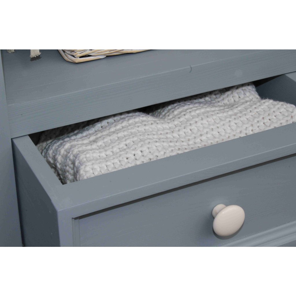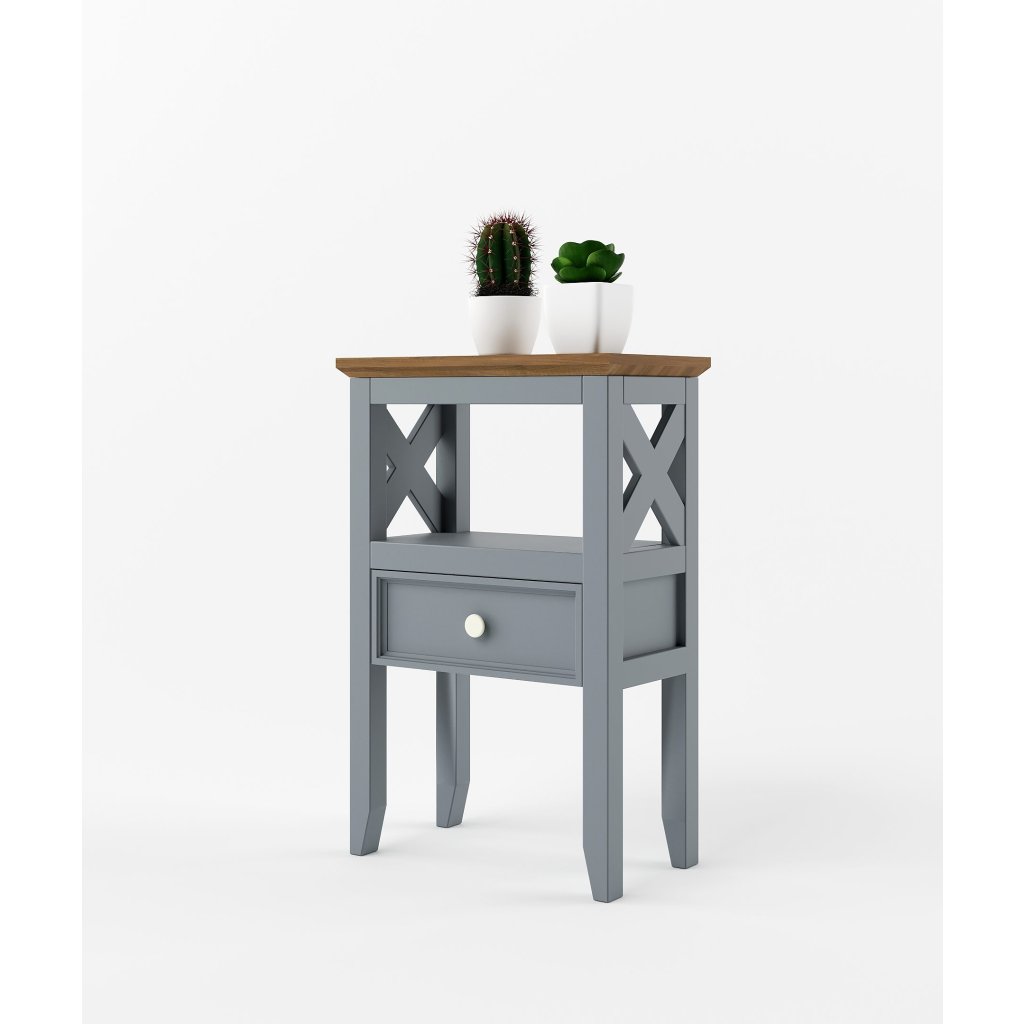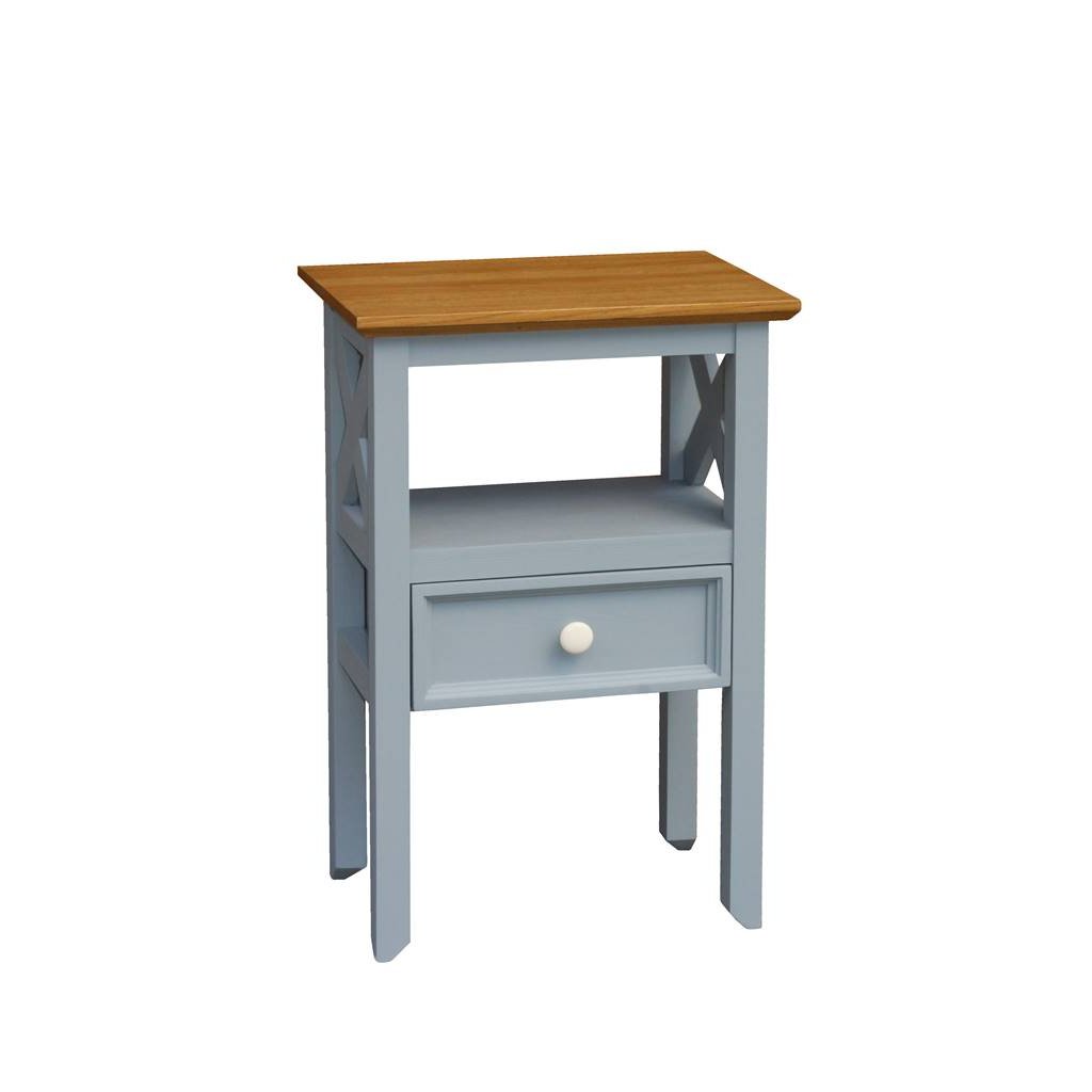 Masivní stolek PROVENCE je spojením bukového a dubového dřeva. Dubové dřevo (horní deska) je ošetřeno lakem a bukové dřevo je ošetřeno akrylovou barvou v šedomodré barvě. Šuplík je bez pojezdů.