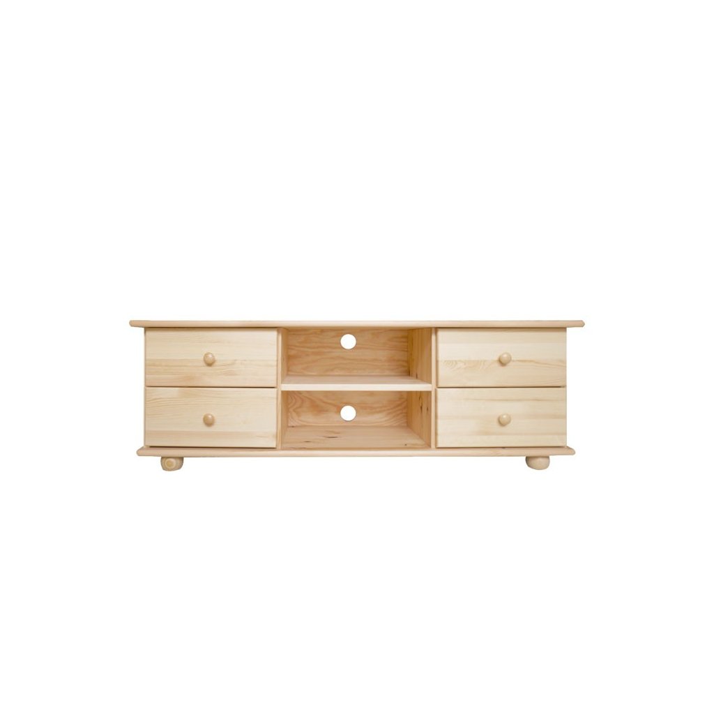 Televizní stolek DEJ61 se skládá ze 4 výsuvných šuplíků, které jsou uchyceny na kvalitních kovových pojezdech a z 1 poličky. Úchytky jsou roztomile kulaté, rovněž z borovicového masívu. V zadní části televizního stolku jsou kulaté otvory na kabely, takže se nemusíte trápit složitým vyřezáváním nebo schováváním kabelů. Celý televizní stolek je postaven na 4 kulatých nožkách.