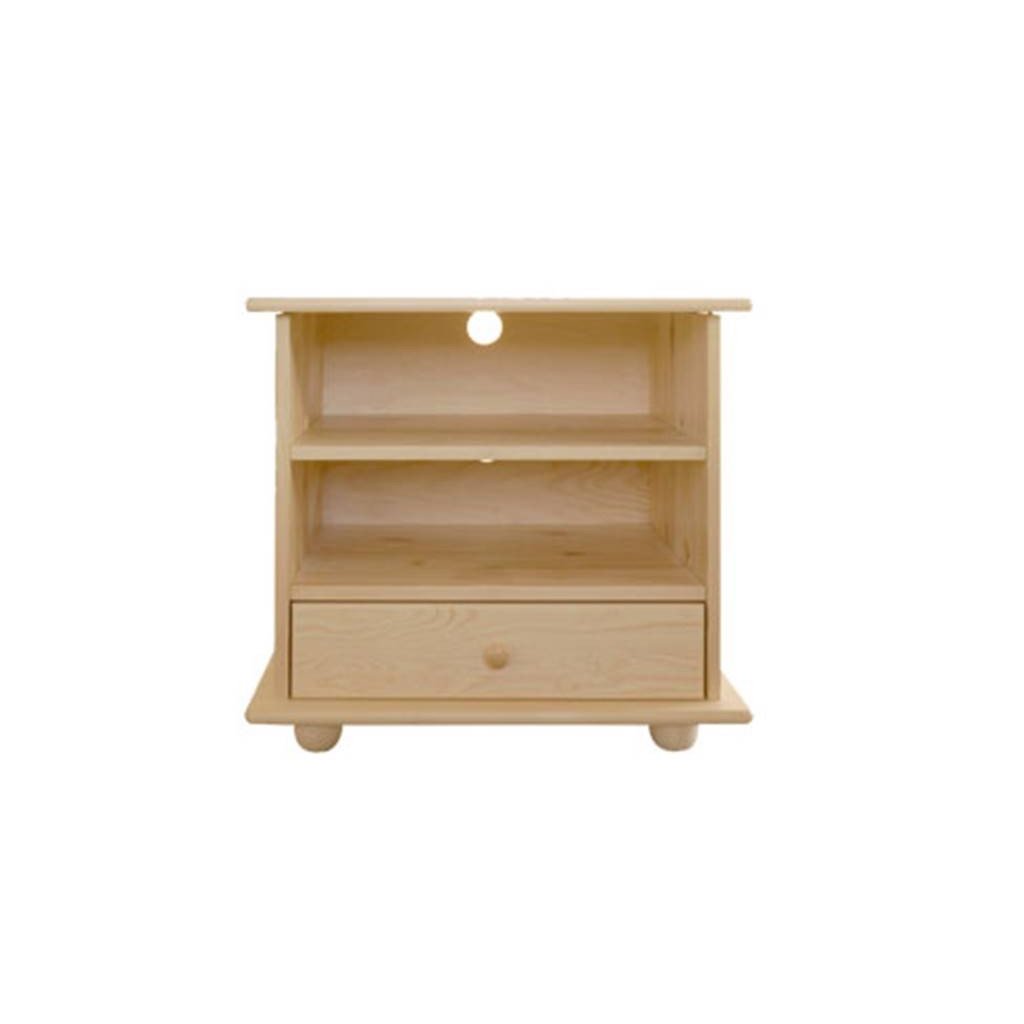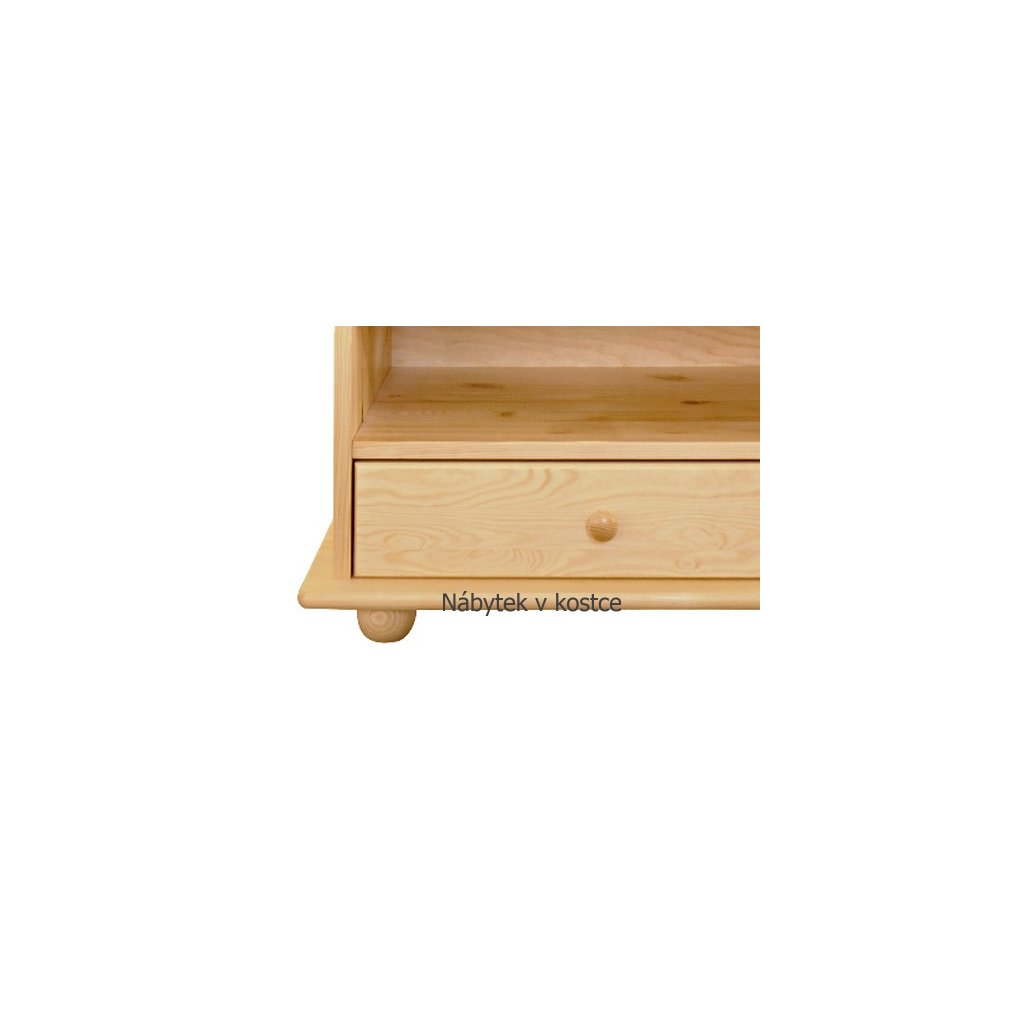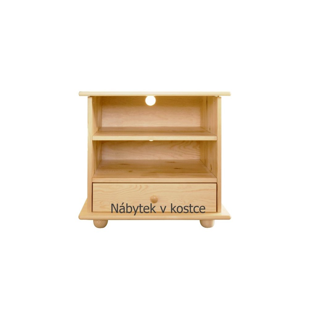 Televizní stolek DEJ64 se skládá z 1 poličky a 1 výsuvného šuplíku, který je uchycen na kvalitních kovových pojezdech. V zadní části televizního stolku jsou kulaté otvory na kabely, takže se nemusíte trápit složitým vyřezáváním nebo schováváním kabelů. Úchytek je roztomile kulatý, rovněž z borovicového masívu. Celý televizní stolek je postaven na 4 kulatých nožkách.