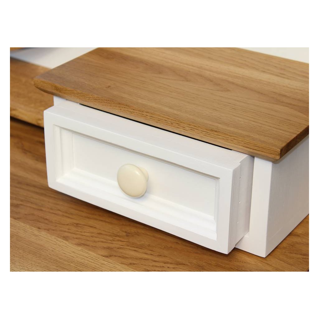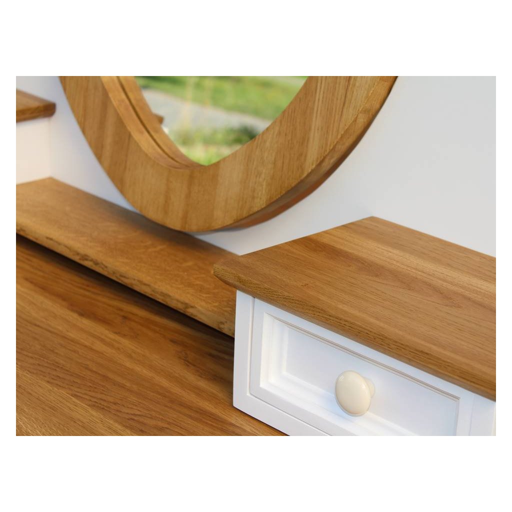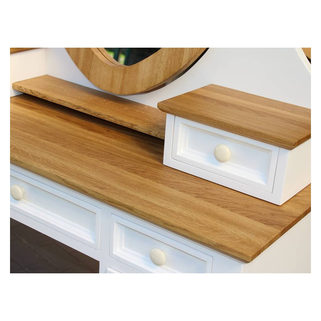 Masivní toaletní stolek PROVENCE je spojením bukového a dubového dřeva. Dubové dřevo (horní deska) je ošetřeno lakem a bukové dřevo je ošetřeno akrylovou barvou v bílé barvě. Šuplíky jsou bez pojezdu. Možnost objednání se systémem tichého dovírání (u šuplíků) - cena na dotaz.
