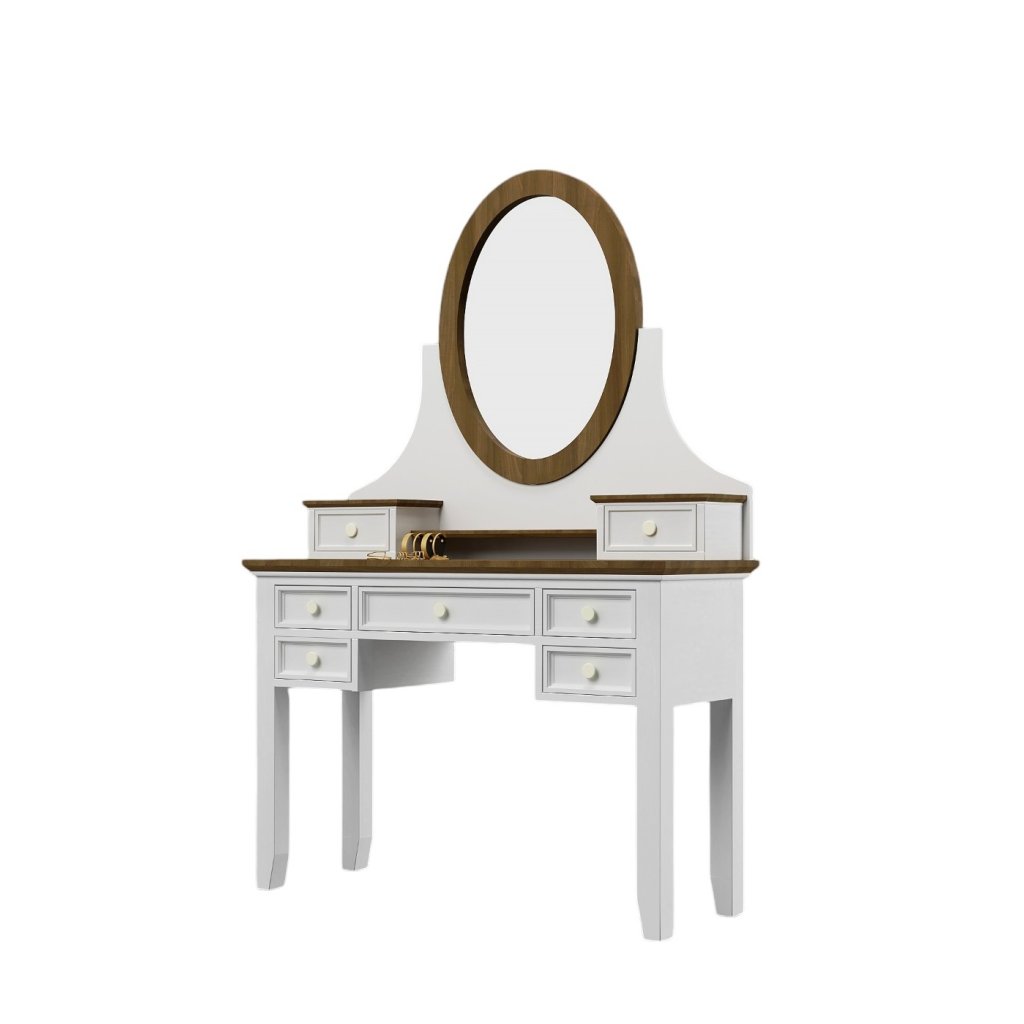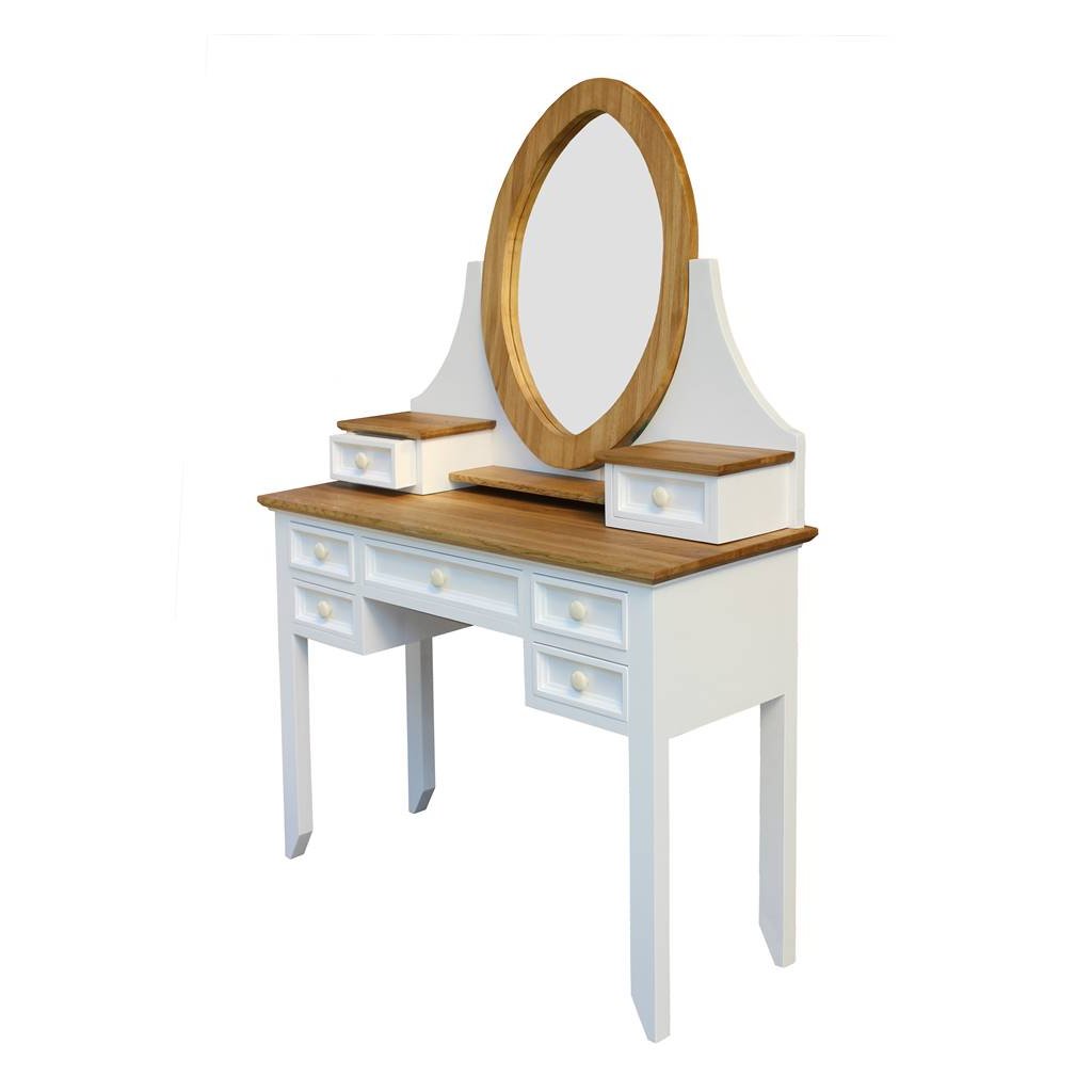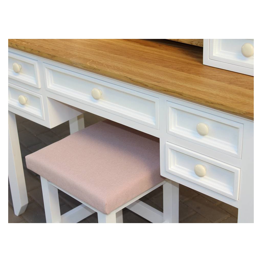 Masivní toaletní stolek PROVENCE je spojením bukového a dubového dřeva. Dubové dřevo (horní deska) je ošetřeno lakem a bukové dřevo je ošetřeno akrylovou barvou v bílé barvě. Šuplíky jsou bez pojezdu. Možnost objednání se systémem tichého dovírání (u šuplíků) - cena na dotaz.