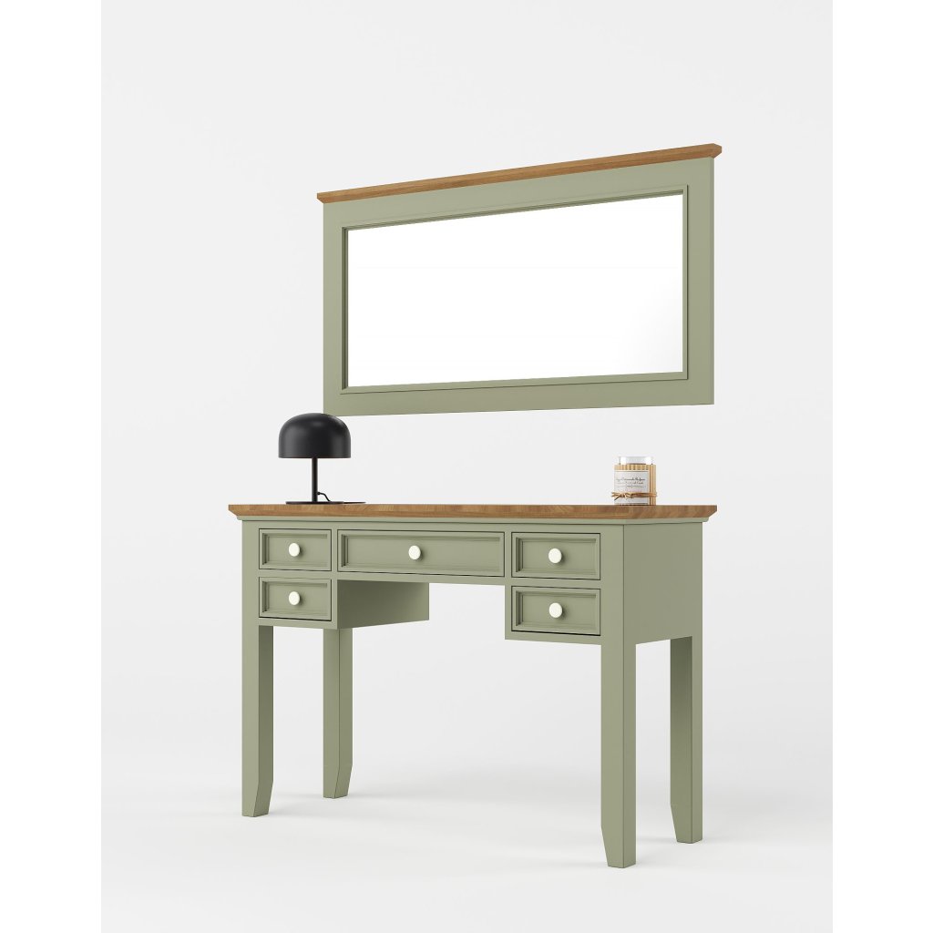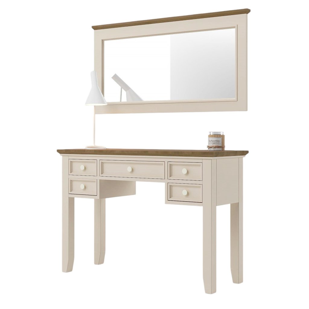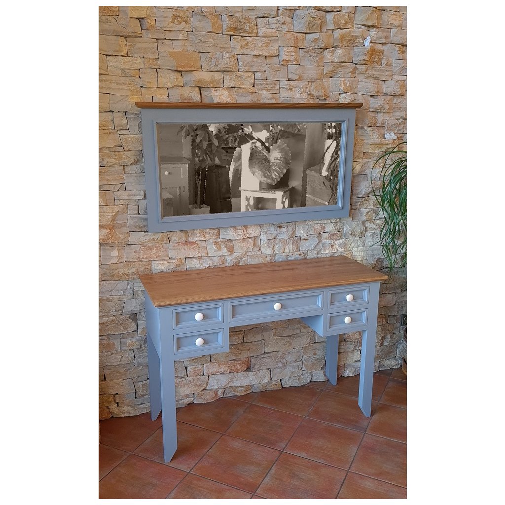 Masivní toaletní stolek PROVENCE je stolek se zrcadlem vyrobený z masivního bukového dřeva, které je ošetřeno akrylovou barvou v krémovém, olivovém, bílém nebo šedomodrém odstínu, a z masivního dubového dřeva (horní deska), které je ošetřeno lakem. Díky spojení těchto dvou druhů masivního dřeva získal masivní stolek jedinečný vzhled, který zdokonalí veškerý interiér.