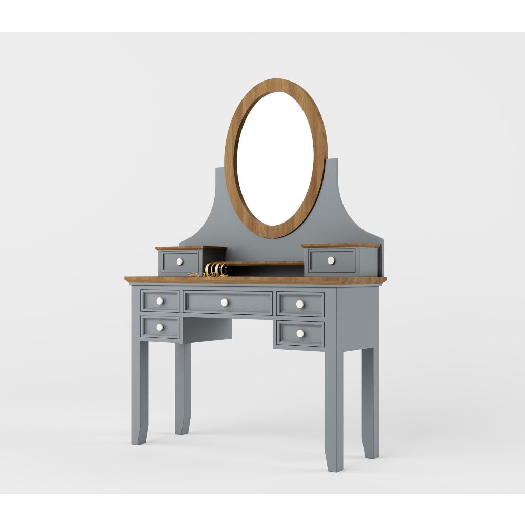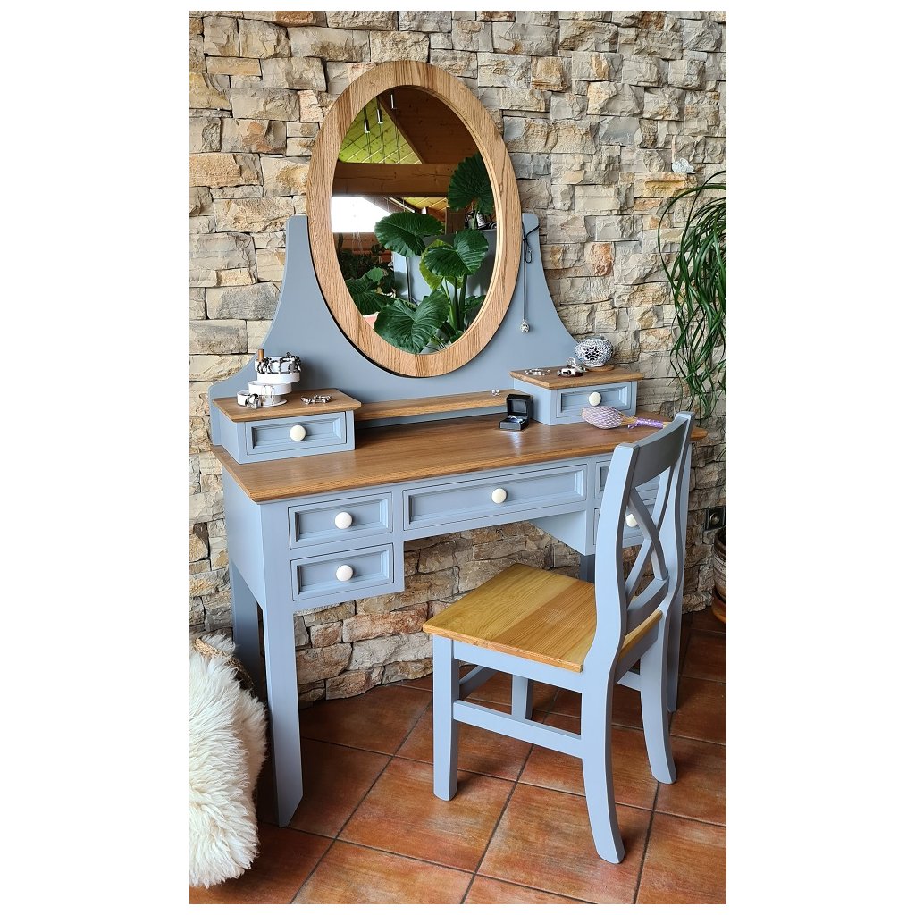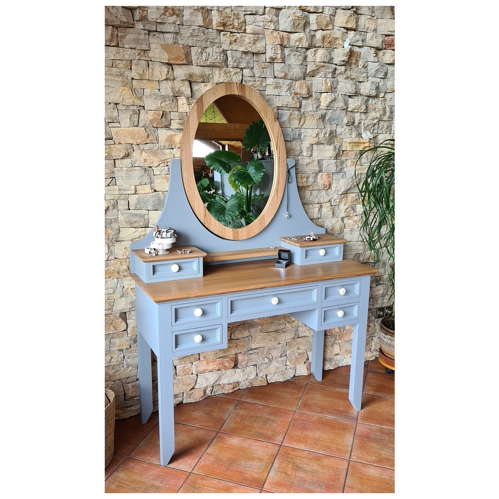 Masivní toaletní stolek PROVENCE je spojením bukového a dubového dřeva. Dubové dřevo (horní deska) je ošetřeno lakem a bukové dřevo je ošetřeno akrylovou barvou v šedomodré barvě. Šuplíky jsou bez pojezdu.