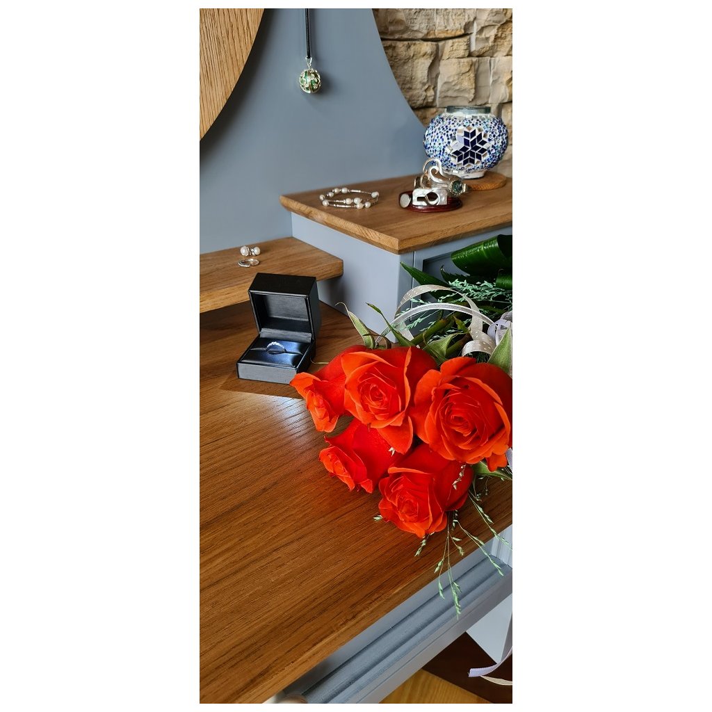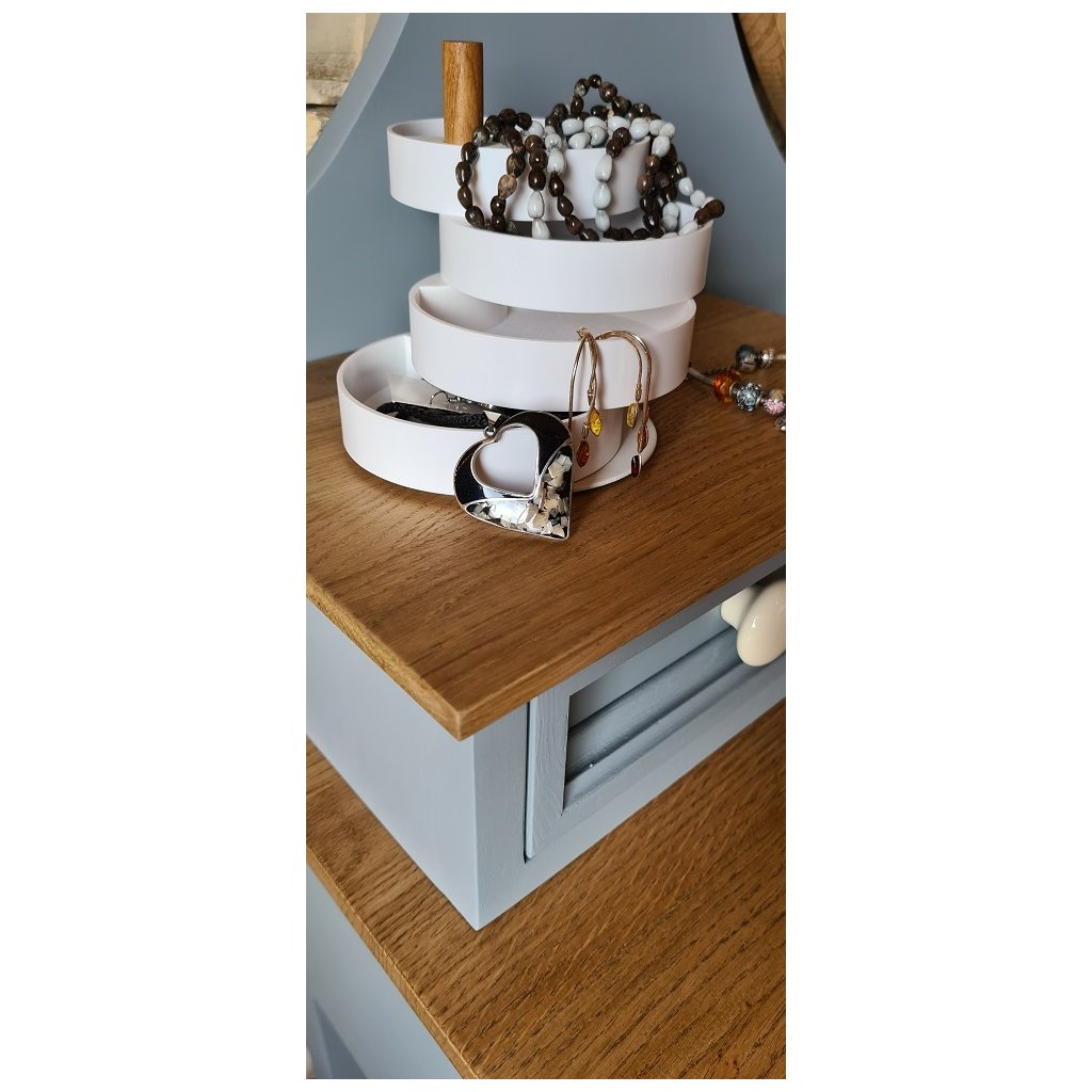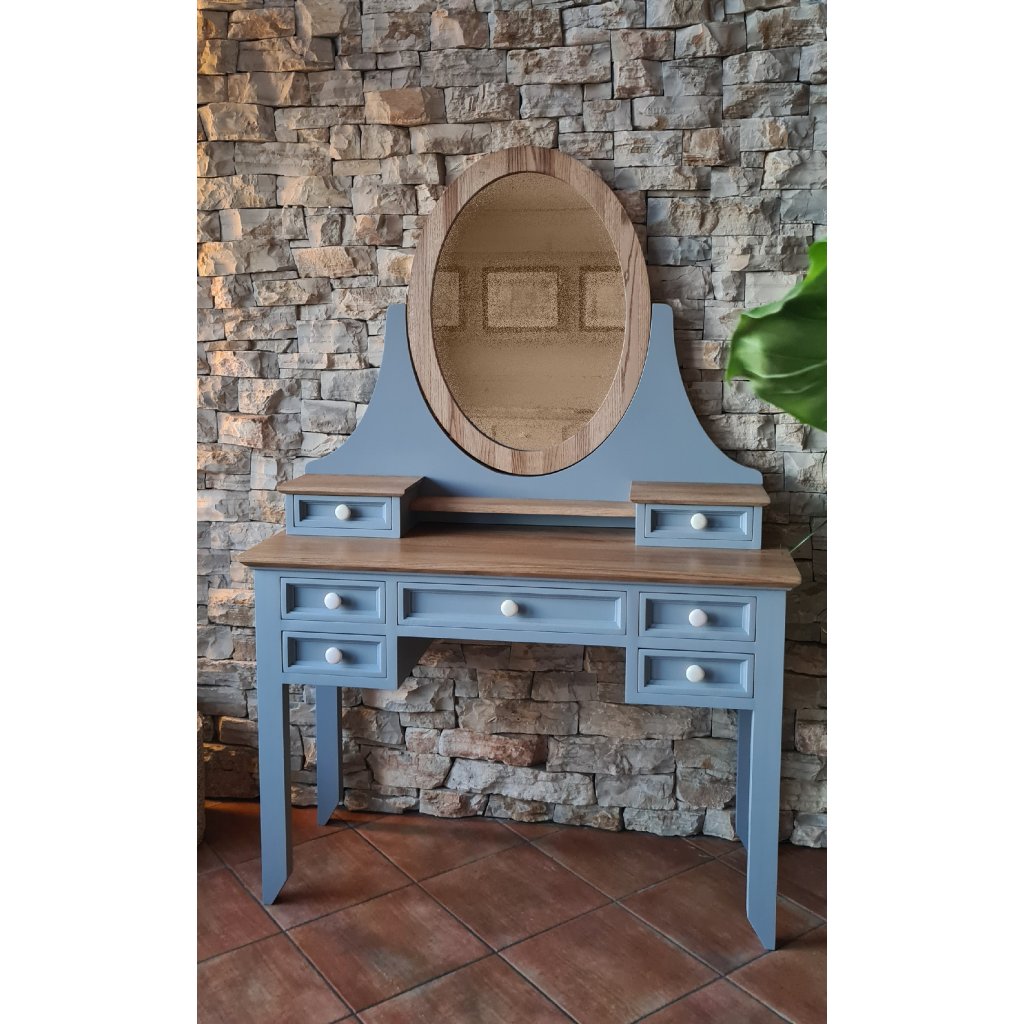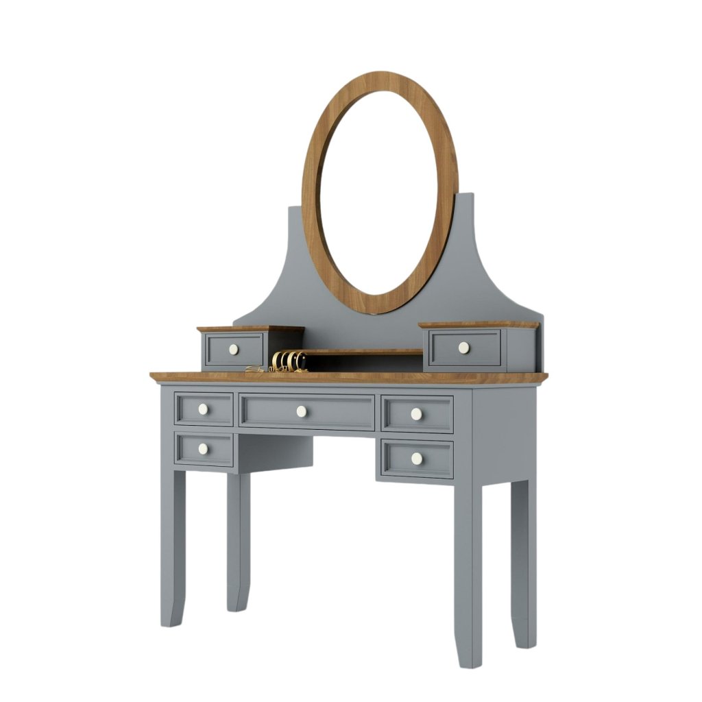 Masivní toaletní stolek PROVENCE je spojením bukového a dubového dřeva. Dubové dřevo (horní deska) je ošetřeno lakem a bukové dřevo je ošetřeno akrylovou barvou v šedomodré barvě. Šuplíky jsou bez pojezdu.