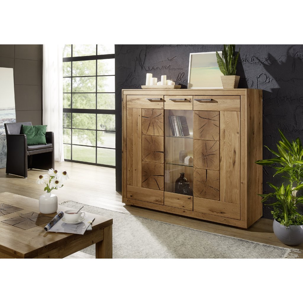 Třídveřová kredenc MANDALA je stylová kredenc, vhodná do Vaší kuchyně nebo jídelny. Kredenc je vyrobena z masivního dubového dřeva se skleněnými dvířky a kovovými úchyty. Výběr tohoto materiálu zajišťuje, že se jedná o produkt špičkové kvality a nábytek má jedinečný vzhled díky svému provedení z masivního dřeva. Povrch nábytku je ošetřen čirým olejem.