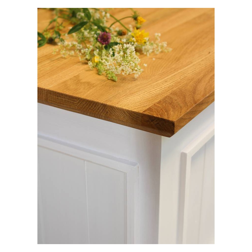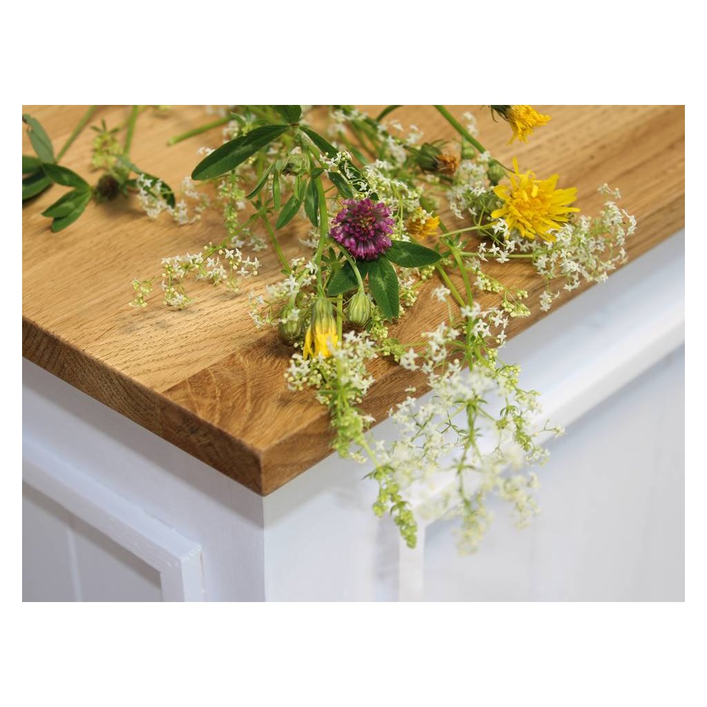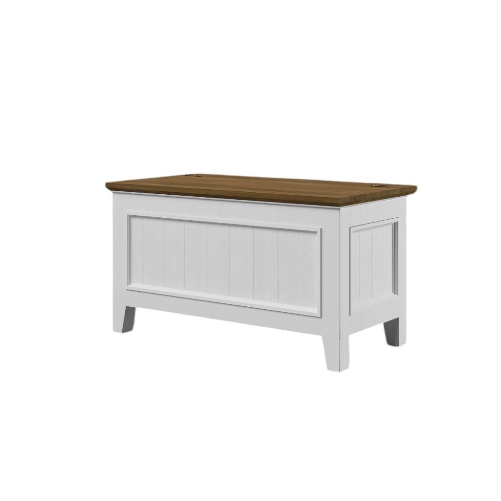 Masivní truhla PROVENCE je spojením bukového a dubového dřeva. Dubové dřevo (horní deska) je ošetřeno lakem a bukového dřevo je ošetřeno akrylovou barvou v bílé barvě.
