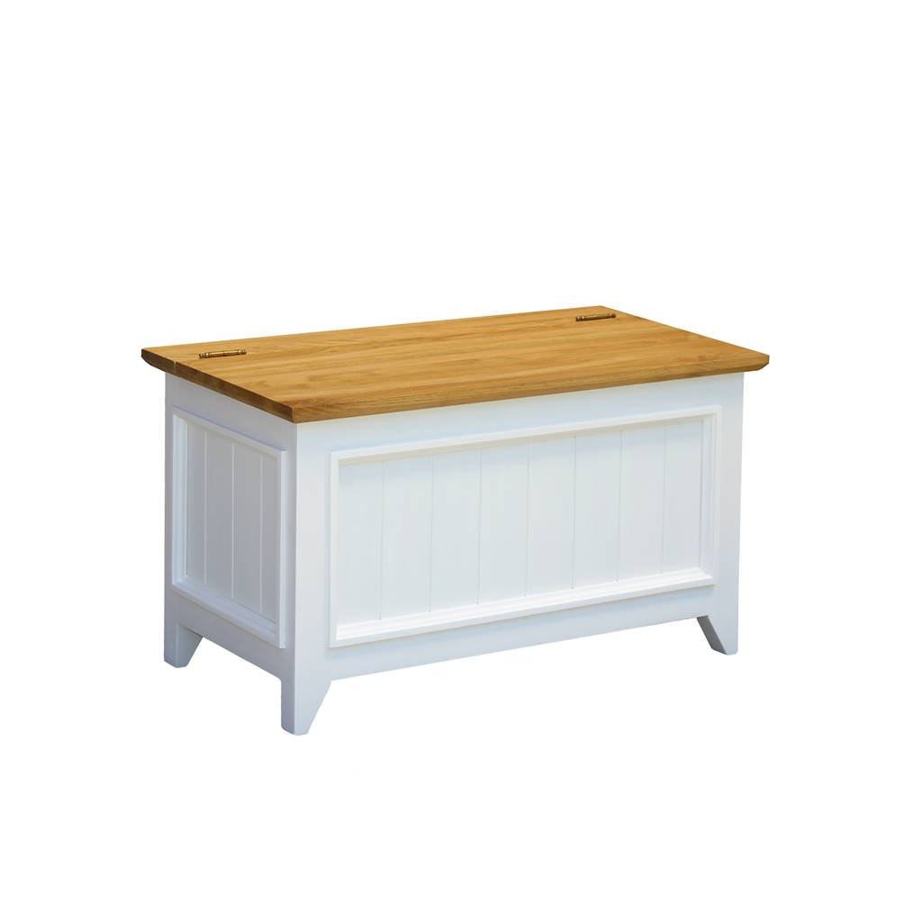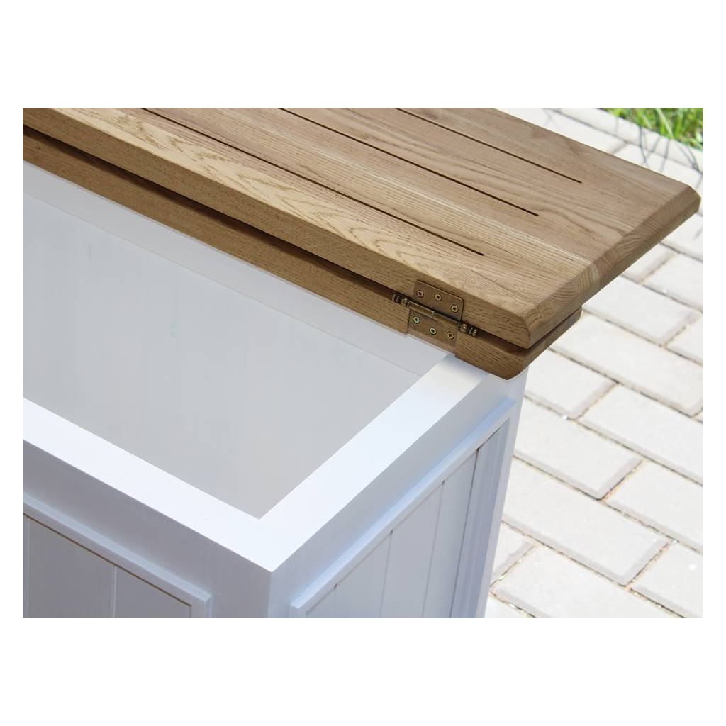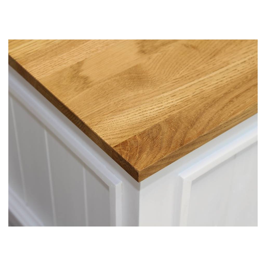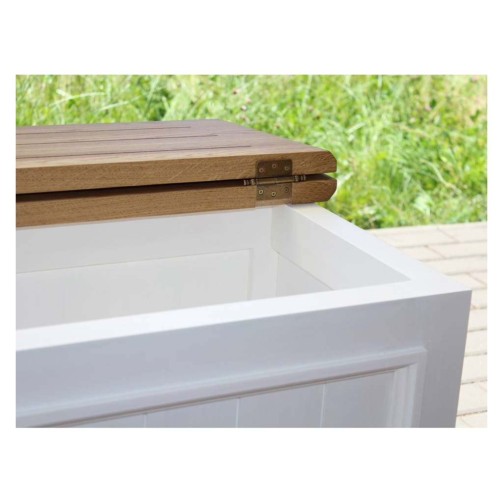 Masivní truhla PROVENCE je spojením bukového a dubového dřeva. Dubové dřevo (horní deska) je ošetřeno lakem a bukového dřevo je ošetřeno akrylovou barvou v bílé barvě.