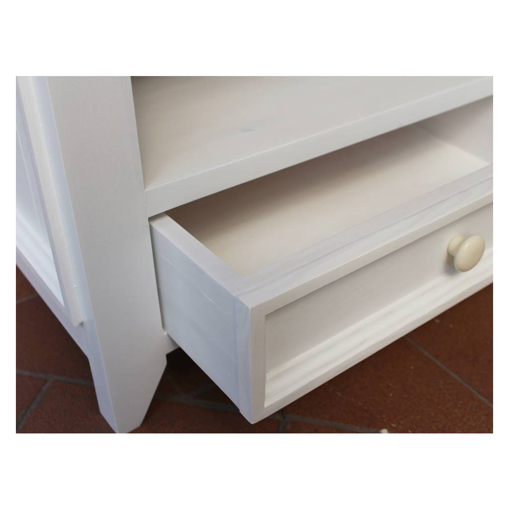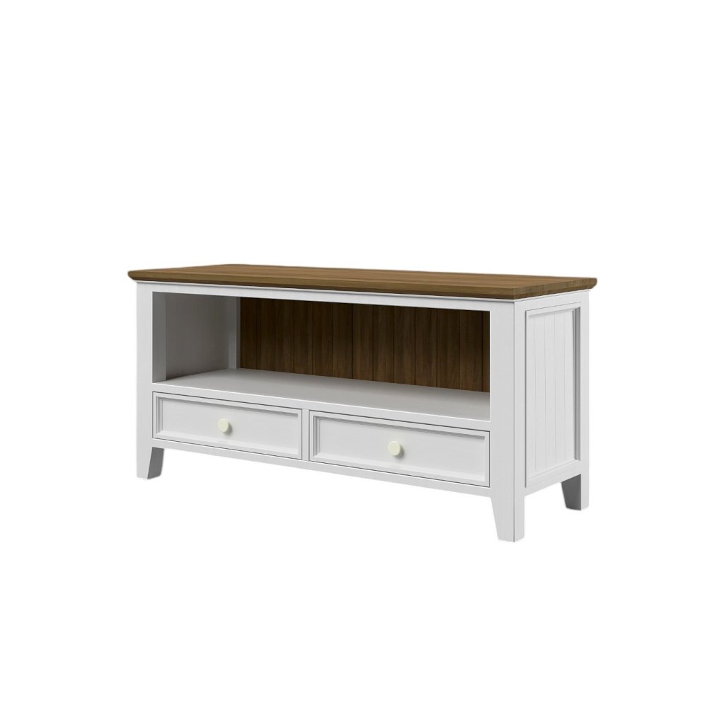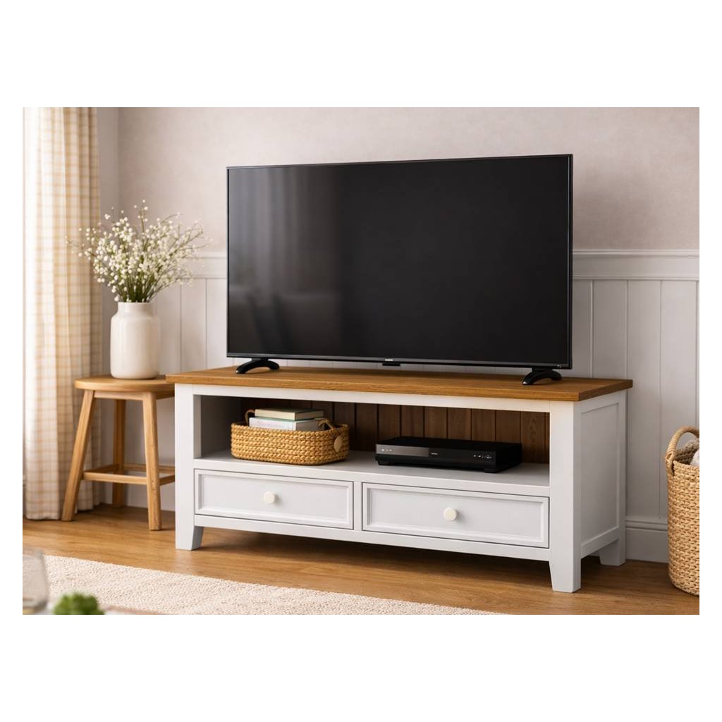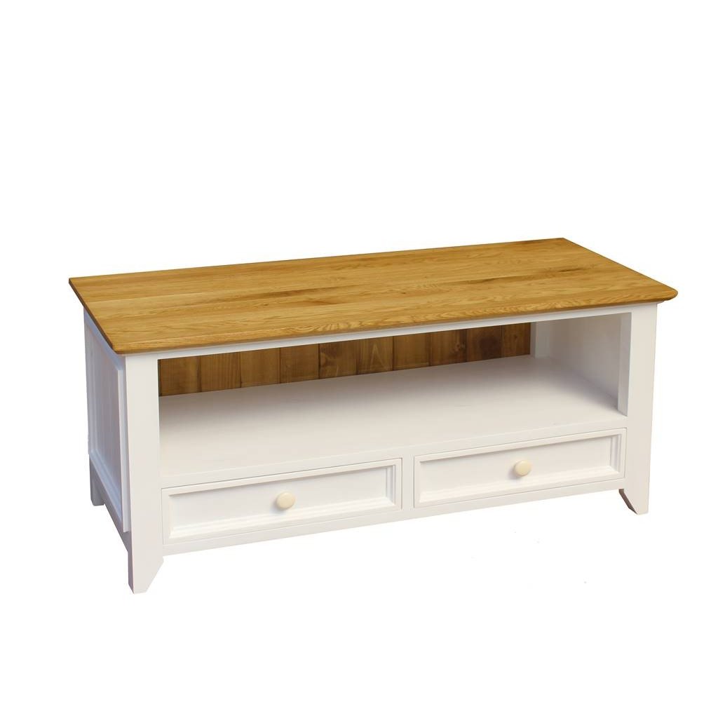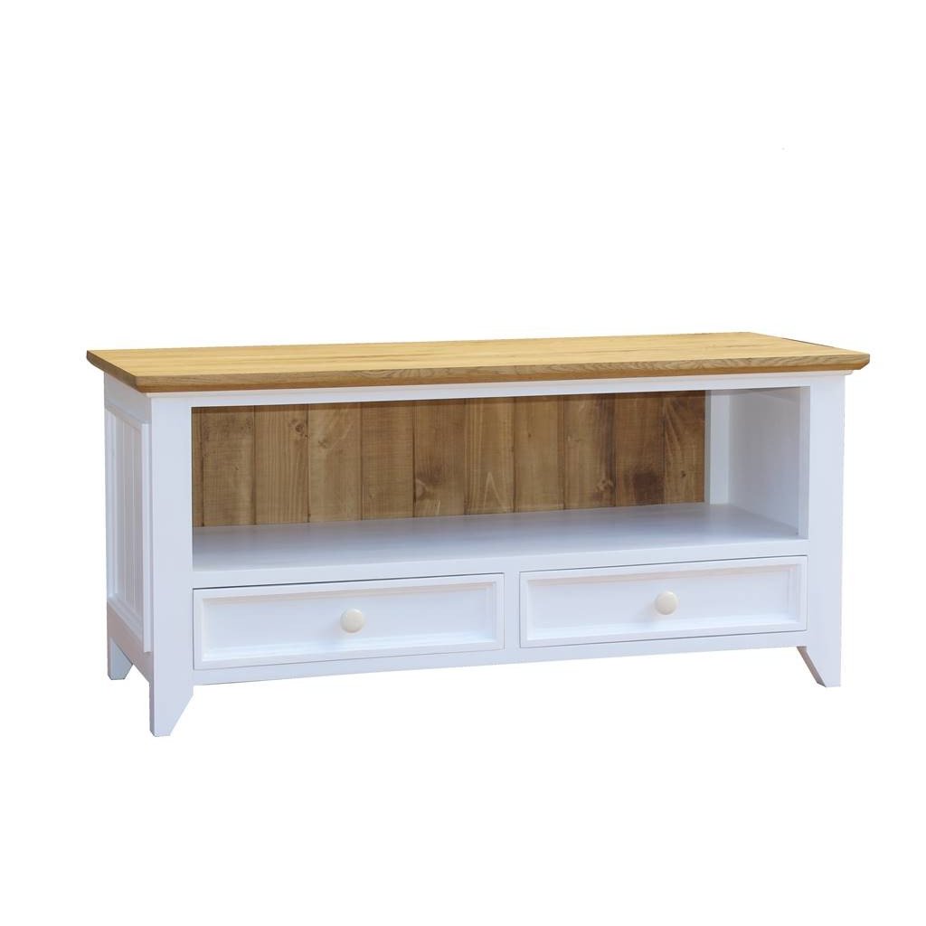 Masivní televizní stolek PROVENCE je spojením bukového a dubového dřeva. Dubové dřevo (horní deska) je ošetřeno olejem a bukové dřevo je ošetřeno akrylovou barvou v bílé barvě.