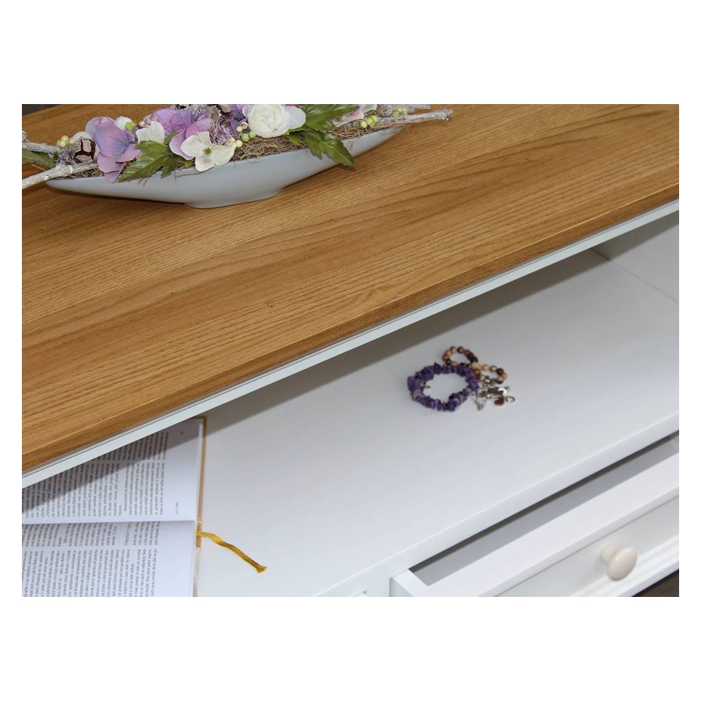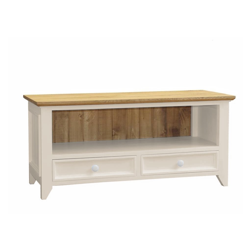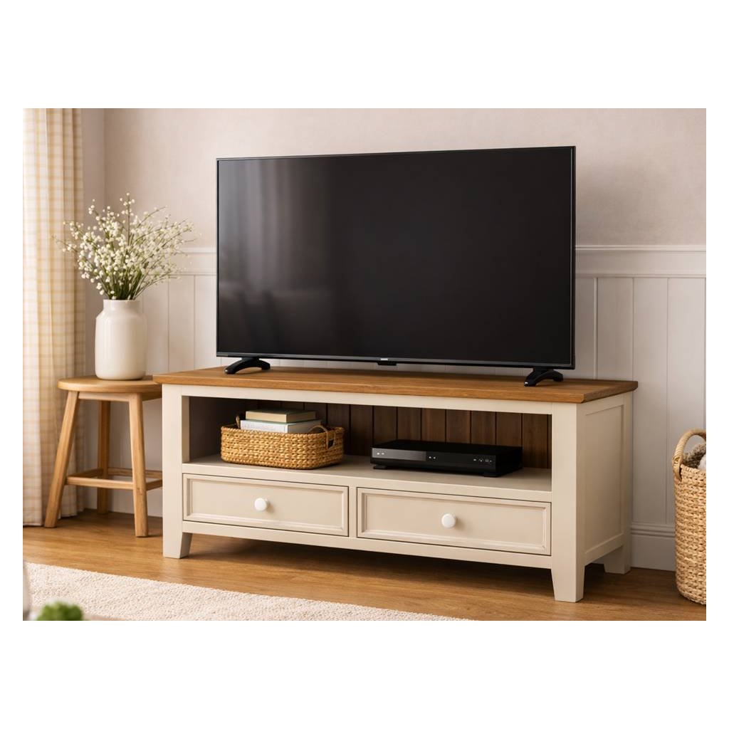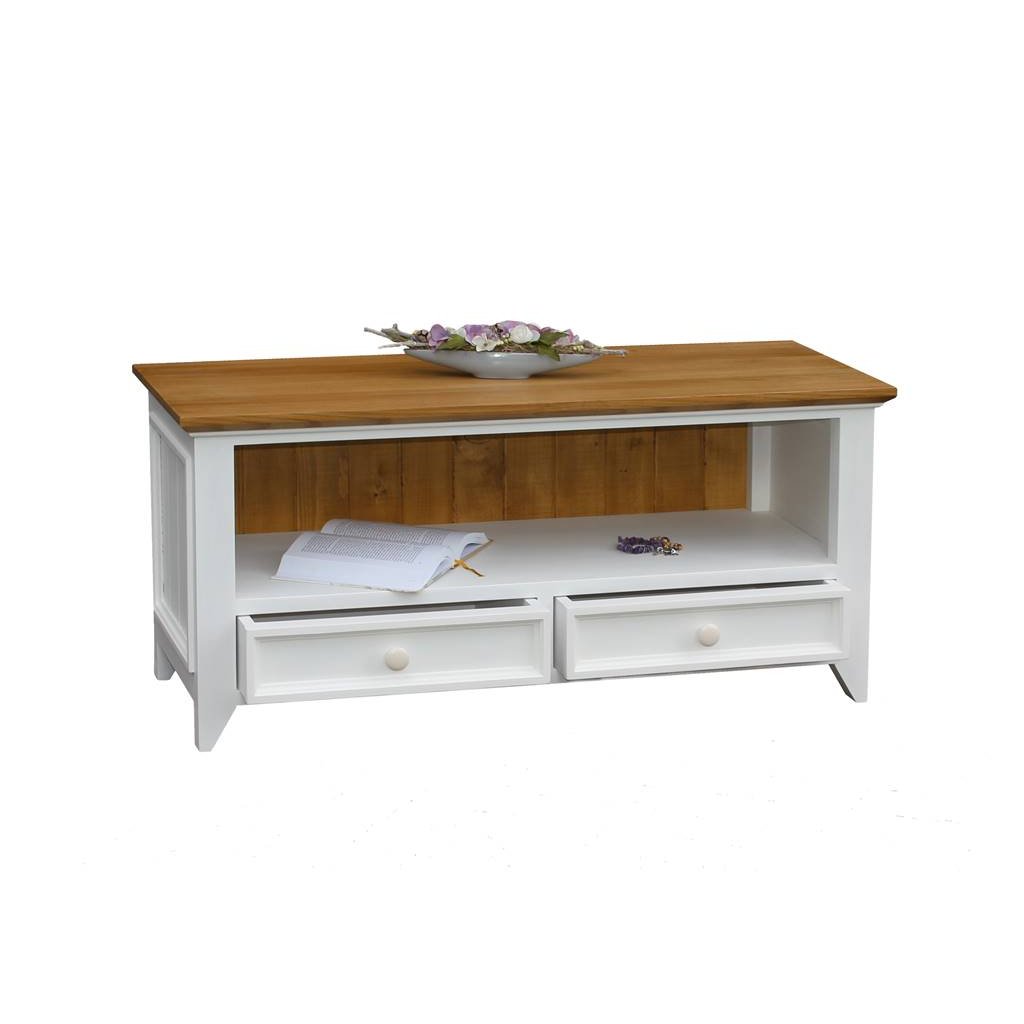 Masivní TV stolek PROVENCE je stolek vyrobený z masivního bukového dřeva, které je ošetřeno akrylovou barvou v krémovém odstínu, a z masivního dubového dřeva (horní deska), které je ošetřeno lakem. Díky spojení těchto dvou druhů masivního dřeva získal masivní stolek jedinečný vzhled, který zdokonalí veškerý interiér.