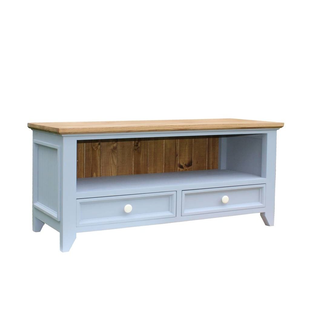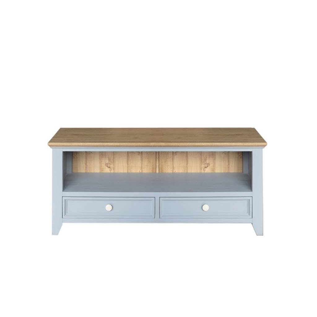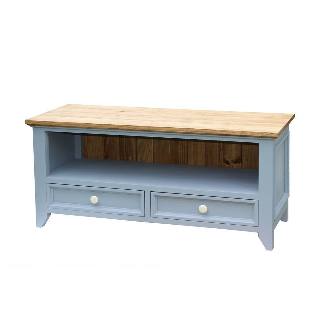 Masivní televizní stolek PROVENCE je spojením bukového a dubového dřeva. Dubové dřevo (horní deska) je ošetřeno lakem a bukové dřevo je ošetřeno akrylovou barvou v šedomodré barvě. Šuplíky jsou bez pojezdů. Možnost objednání se systémem tichého dovírání (u šuplíků) - cena na dotaz.