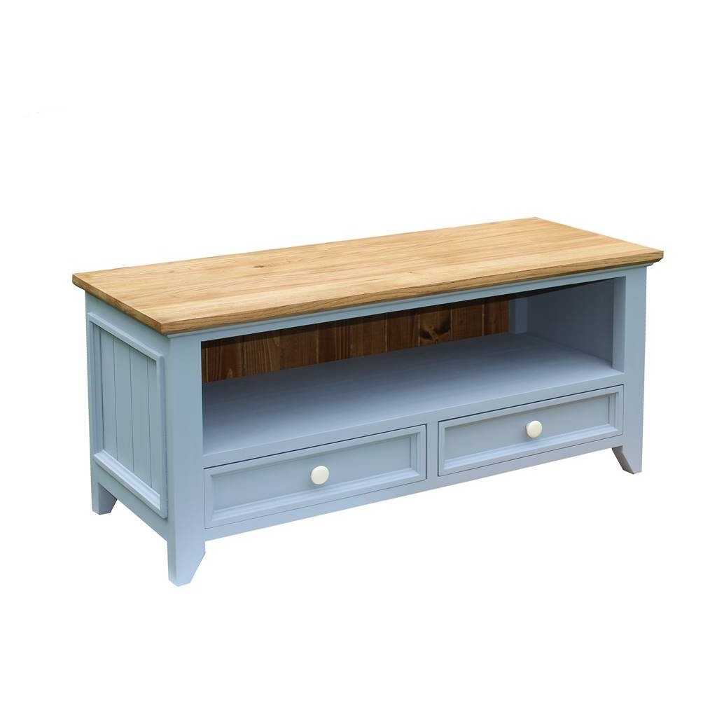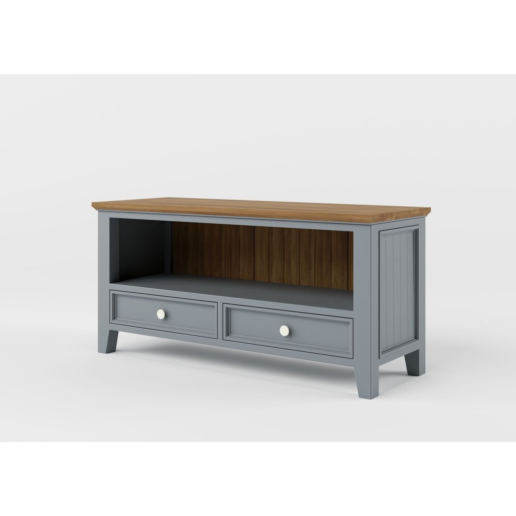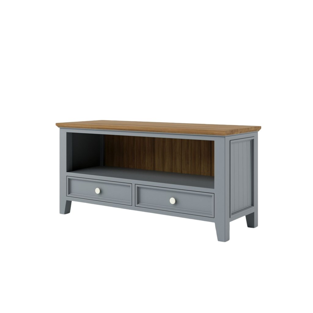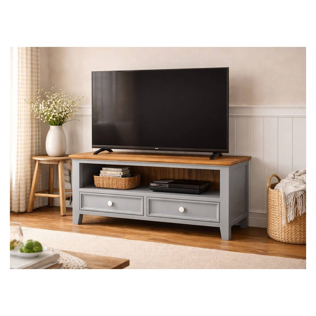 Masivní televizní stolek PROVENCE je spojením bukového a dubového dřeva. Dubové dřevo (horní deska) je ošetřeno lakem a bukové dřevo je ošetřeno akrylovou barvou v šedomodré barvě. Šuplíky jsou bez pojezdů. Možnost objednání se systémem tichého dovírání (u šuplíků) - cena na dotaz.