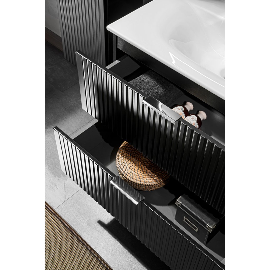 Umyvadlová skříňka Ama Black je nástěnná skříňka se dvěma frézovanými šuplíky, které jsou vybaveny systémem tichého dojezdu. Na skříňku lze namontovat zápustné i závěsné umyvadlo či ji doplnit o desku v případě umyvadlové mísy. Skříňka je k dostání v matném černém provedení, přičemž barvu úchytek lze dodat ve 3 možných variantách, a to lesklé zlaté, lesklé chromované a matné černé.