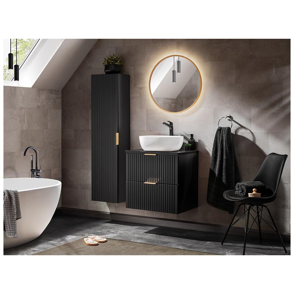 Kolekce Ama Black představuje moderní frézovaný koupelnový nábytek, který je vyroben z kvalitních materiálů v elegantním matně černém provedení. Kolekce byla navržena s ohledem na praktičnost při současném zachování elegantního vzhledu. Veškerý nábytek z kolekce je proto nástěnný a šuplíky i čela skříněk jsou vybaveny systémem tichého dojezdu a dovírání. Kolekce Ama Black zahrnuje kromě vysoké nástěnné skříňky s poličkami také umyvadlové skříňky se šuplíky, které lze doplnit o desku pro umístění umyvadlové mísy.