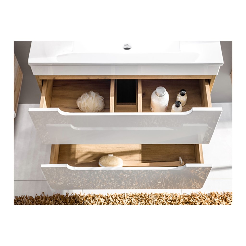 Umyvadlová skříňka Aruba White je kvalitní dřevěná skříňka, jejíž korpus je vyroben ve stylovém dekoru zlatého dubu. Skříňku doplňují dvířka v nadčasové leskle bílé barvě. Dostatek úložného prostoru je zajištěn pomocí dvou šuplíků, které disponují systémem tichého dojezdu. Umyvadlová skříňka Aruba White je díky své šířce pouhých 40 cm vhodná i do menších koupelen a lze ji libovolně kombinovat s dalším nábytkem z koupelnové kolekce Aruba White.