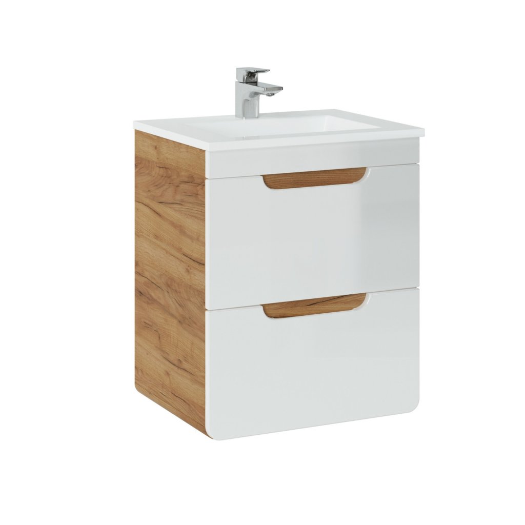 Umyvadlová skříňka Aruba White je kvalitní dřevěná skříňka, jejíž korpus je vyroben ve stylovém dekoru zlatého dubu. Skříňku doplňují dvířka v nadčasové leskle bílé barvě. Dostatek úložného prostoru je zajištěn pomocí dvou šuplíků, které disponují systémem tichého dojezdu. Umyvadlová skříňka Aruba White je díky své šířce pouhých 50 cm vhodná i do menších koupelen a lze ji libovolně kombinovat s dalším nábytkem z koupelnové kolekce Aruba White.