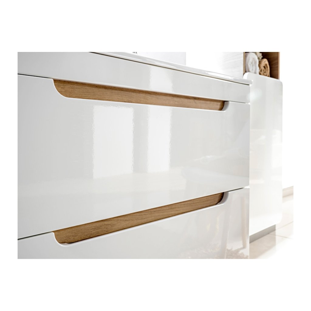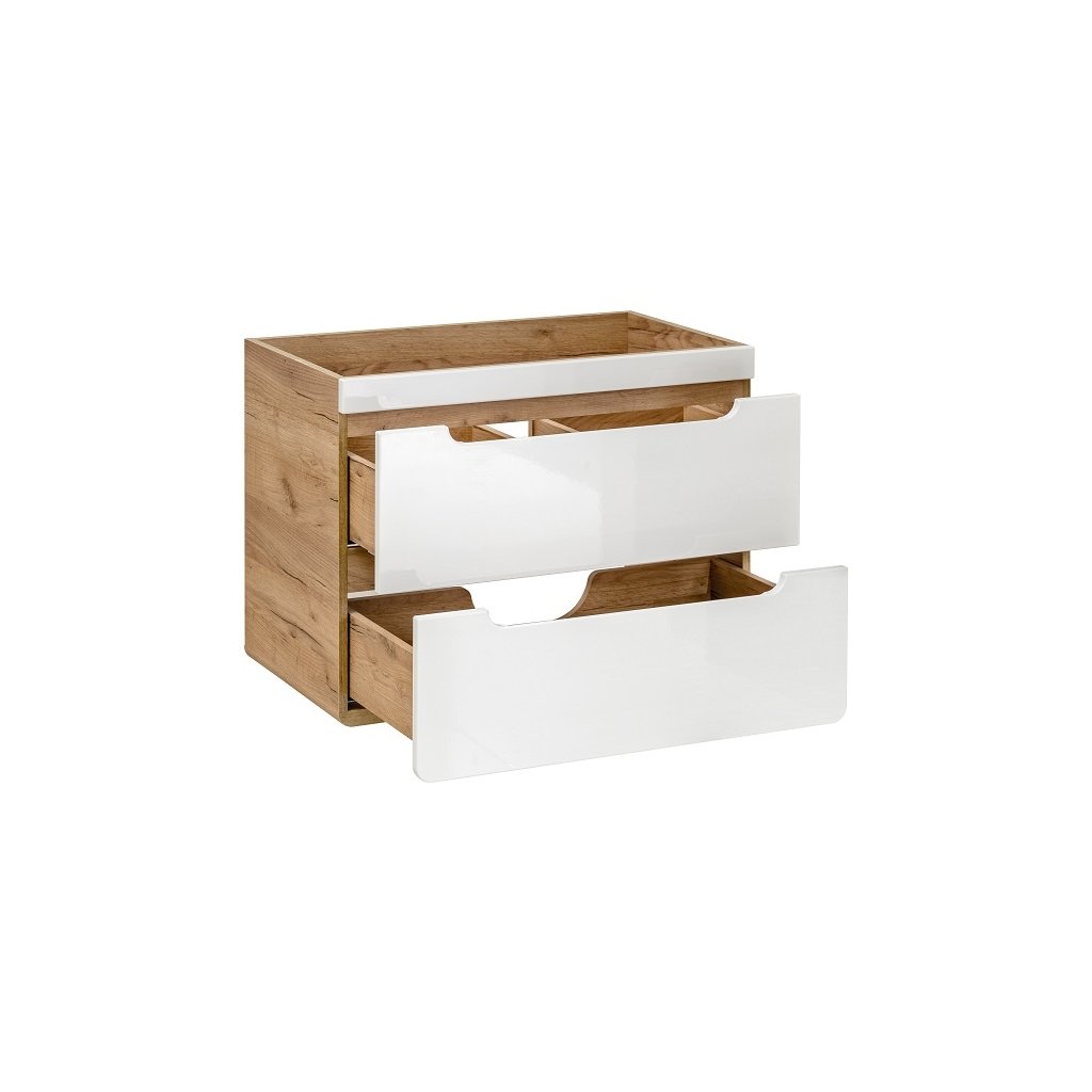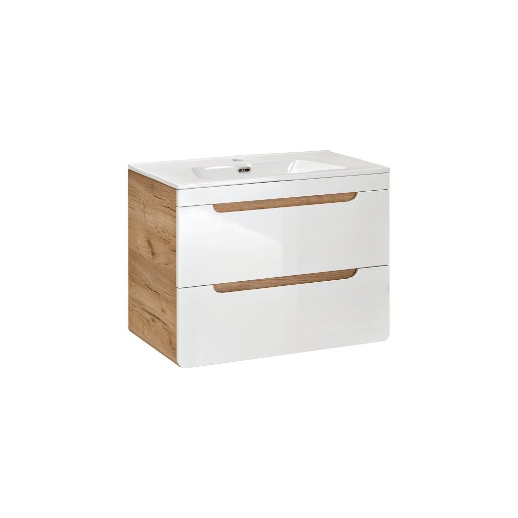 Umyvadlová skříňka Aruba White je kvalitní dřevěná skříňka, jejíž korpus je vyroben ve stylovém dekoru zlatého dubu. Skříňku doplňují dvířka v nadčasové leskle bílé barvě. Dostatek úložného prostoru je zajištěn pomocí dvou šuplíků, které disponují systémem tichého dojezdu. Umyvadlovou skříňku lze libovolně kombinovat s dalším nábytkem z koupelnové kolekce Aruba White.